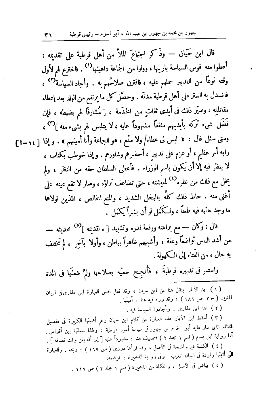 قَالَ ابْن حَيَّان وَذكر اجْتِمَاع الْمَلأ من أهل قرطبة على تَقْدِيمه أعْطوا مِنْهُ قَوس السياسة باريها وولوا من الْجَمَاعَة داهيتها فاخترع لَهُم لأوّل وقته نوعا من التَّدْبِير حملهمْ عَلَيْهِ فاقترن صَلَاحهمْ بِهِ وأجاد السياسة فانسدل بِهِ السّتْر على أهل قرطبة مدَّته وحصّل كل مَا يرْتَفع من الْبَلَد بعد إِعْطَاء مقاتلته وصيّر ذَلِك فِي أَيدي ثِقَات من الْخدمَة مشارفا لَهُم بضبطه فَإِن فضل شَيْء تَركه بِأَيْدِيهِم مثقفاً مشهوداً عَلَيْهِ لَا يتلبس لَهُم بِشَيْء مِنْهُ