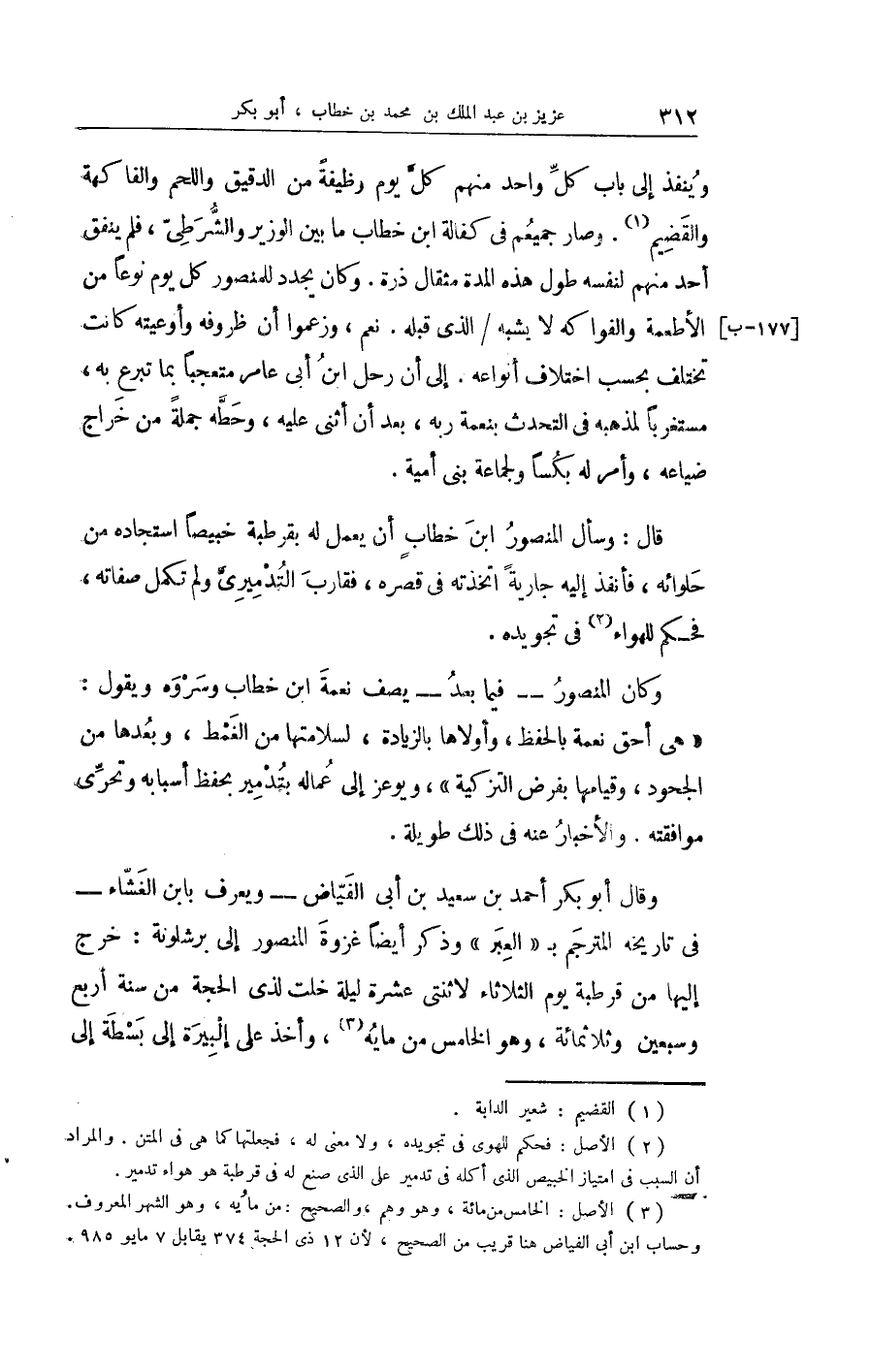 وَينفذ إِلَى بَاب كلّ وَاحِد مِنْهُم كلّ يَوْم وَظِيفَة من الدَّقِيق وَاللَّحم والفاكهة والقضيم وَصَارَ جَمِيعهم فِي كَفَالَة ابْن خطاب مَا بَين الْوَزير والشّرطيّ فَلم ينْفق أحد مِنْهُم لنَفسِهِ طول هَذِه الْمدَّة مِثْقَال ذرة وَكَانَ يجدد للمنصور كل يَوْم نوعا من الْأَطْعِمَة والفواكه لَا يشبه الَّذِي قبله نعم وَزَعَمُوا أَن ظروفه وأوعيته كَانَت تخْتَلف بِحَسب اخْتِلَاف أَنْوَاعه إِلَى أَن رَحل ابْن أبي عَامر مُتَعَجِّبا بِمَا تبرع بِهِ مستغرباً لمذهبه فِي التحدث بِنِعْمَة ربه بعد أَن أثنى عَلَيْهِ وحطّه جملَة من خراج ضيَاعه وَأمر لَهُ بكساً ولجماعة بني أُميَّة