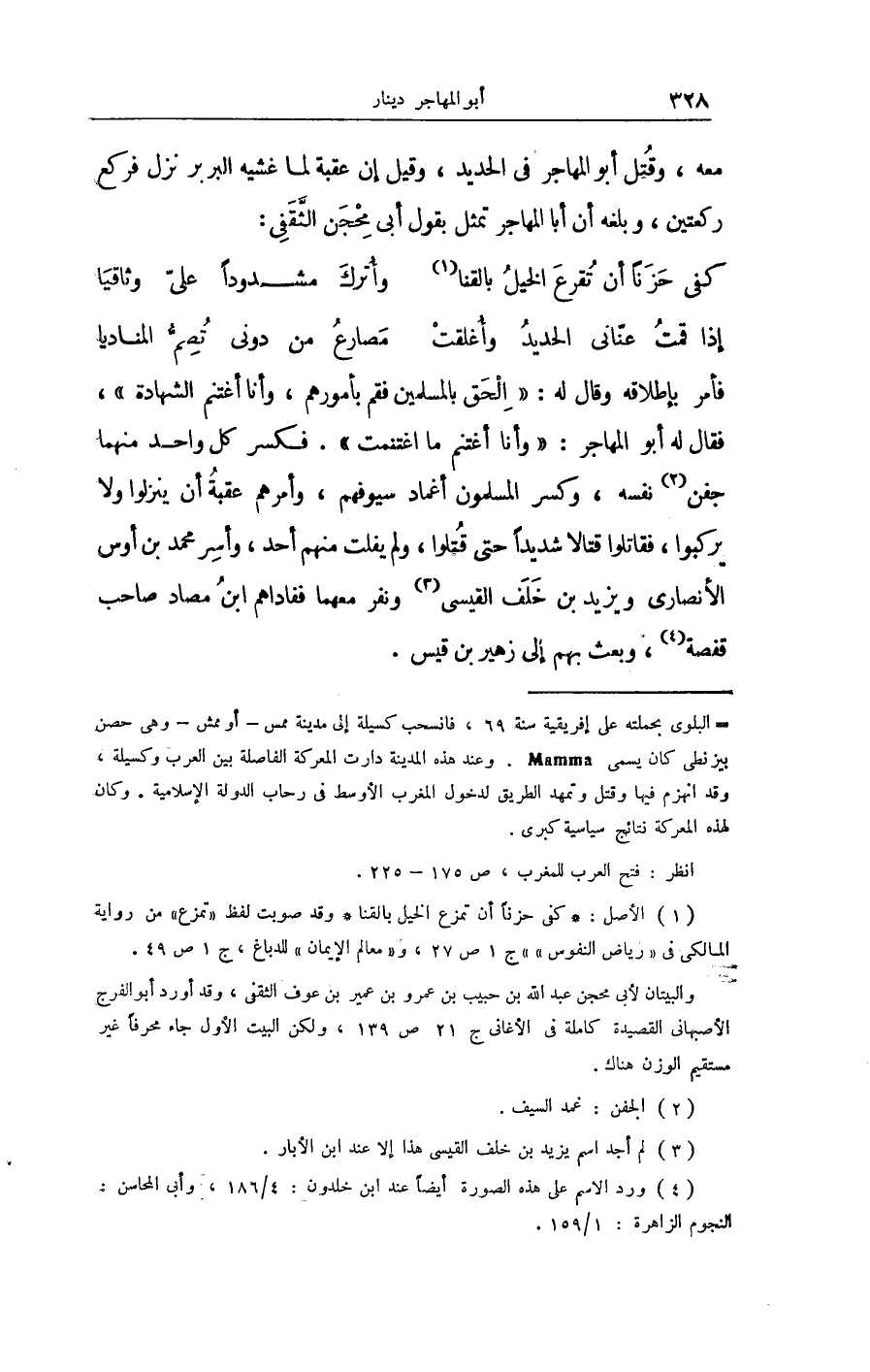 مَعَه وَقتل أَبُو المُهَاجر فِي الْحَدِيد وَقيل إِن عقبَة لما غشيه البربر نزل فَرَكَعَ رَكْعَتَيْنِ وبلغه أَن أَبَا المُهَاجر تمثل بقول أبي محجن الثّقفي