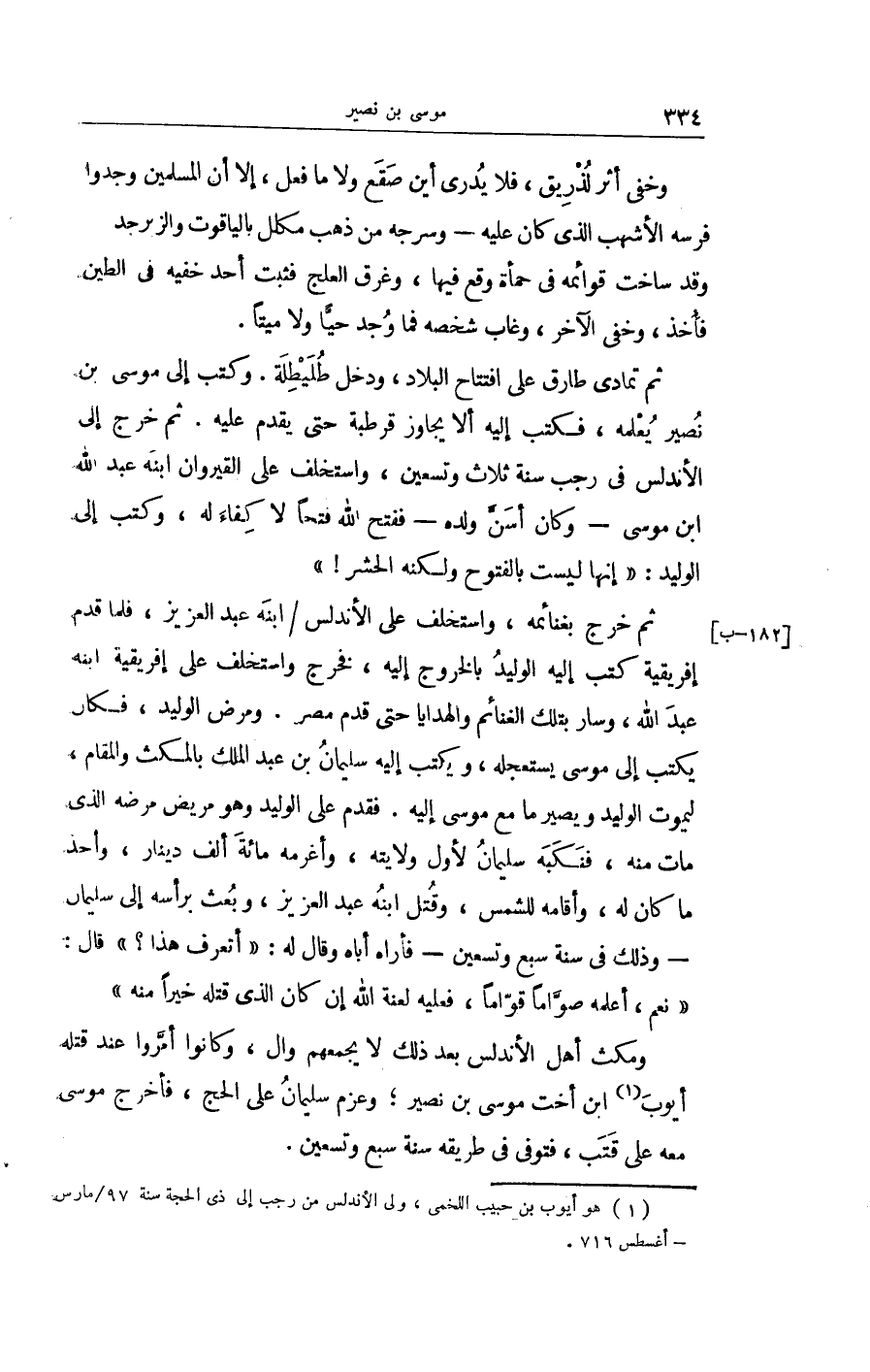 ثمَّ خرج بغنائمه واستخلف على الأندلس ابْنه عبد الْعَزِيز فَلَمَّا قدم إفريقية كتب إِلَيْهِ الْوَلِيد بِالْخرُوجِ إِلَيْهِ فَخرج واستخلف على إفريقية ابْنه عبد الله وَسَار بِتِلْكَ الْغَنَائِم والهدايا حَتَّى قدم مصر وَمرض الْوَلِيد فَكَانَ يكْتب إِلَى مُوسَى يستعجله وَيكْتب إِلَيْهِ سُلَيْمَان بن عبد الْملك بالمكث وَالْمقَام ليَمُوت الْوَلِيد وَيصير مَا مَعَ مُوسَى إِلَيْهِ فَقدم على الْوَلِيد وَهُوَ مَرِيض مَرضه الَّذِي مَاتَ مِنْهُ فنكبه سُلَيْمَان لأوّل ولَايَته وأغرمه مائَة ألف دِينَار وَأخذ مَا كَانَ لَهُ وأقامه للشمس وَقتل ابْنه عبد الْعَزِيز وَبعث بِرَأْسِهِ إِلَى سُلَيْمَان وَذَلِكَ فِي سنة سبع وَتِسْعين فَأرَاهُ أَبَاهُ وَقَالَ لَهُ أتعرف هَذَا قَالَ نعم أعلمهُ صوّاماً قوّاماً فَعَلَيهِ لعنة الله إِن كَانَ الَّذِي قَتله خيرا مِنْهُ