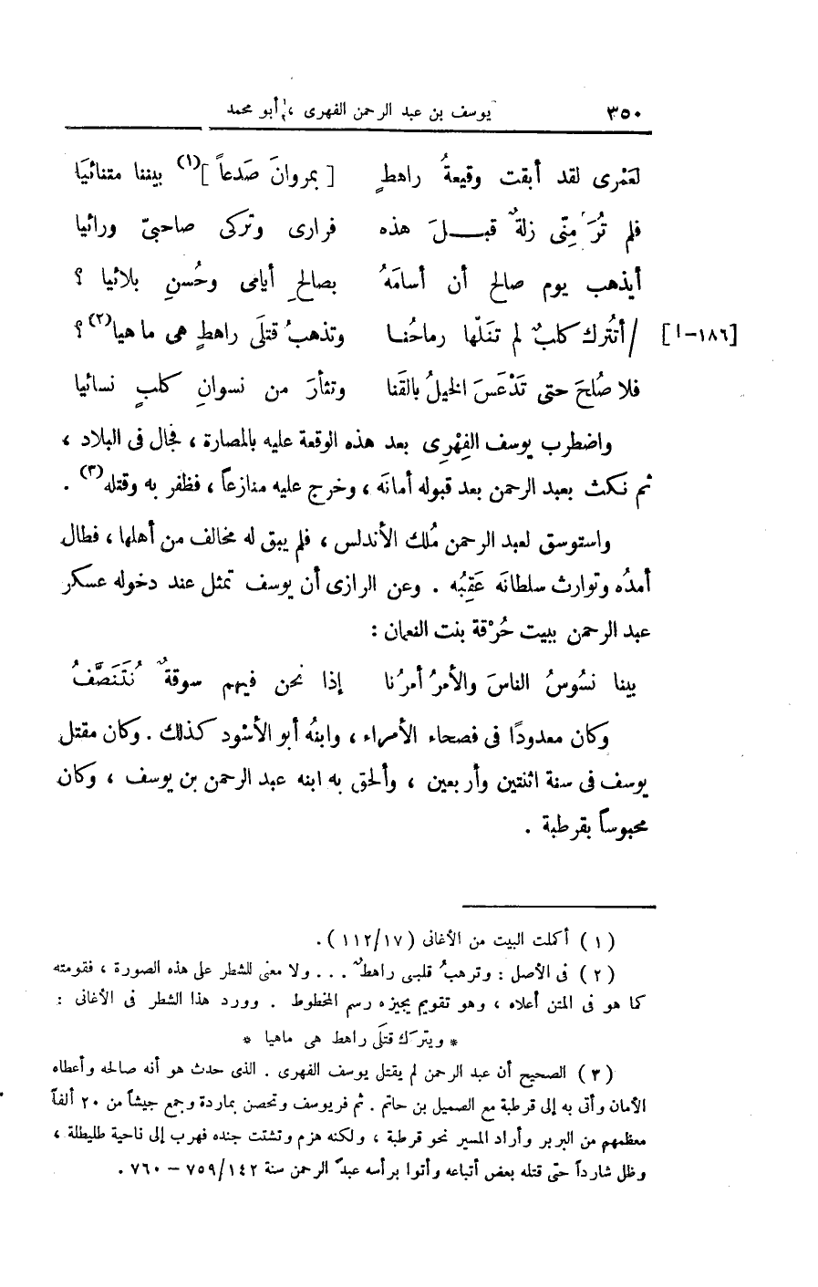 وَحكى أَن اجْتِمَاع النَّاس على الْبيعَة ليوسف كَانَ فِي شهر ربيع الآخر سنة تسع وَعشْرين وَمِائَة وَفِي مثل هَذَا الشَّهْر من سنة ثَمَان وَثَلَاثِينَ حل بمرفأ حصن المنكّب عبد الرَّحْمَن بن مُعَاوِيَة فَالتقى هُوَ ويوسف يَوْم الْأَضْحَى فَانْهَزَمَ يُوسُف وَقتل كثير من أَصْحَابه وَغلب عبد الرَّحْمَن يَوْمئِذٍ على الْملك