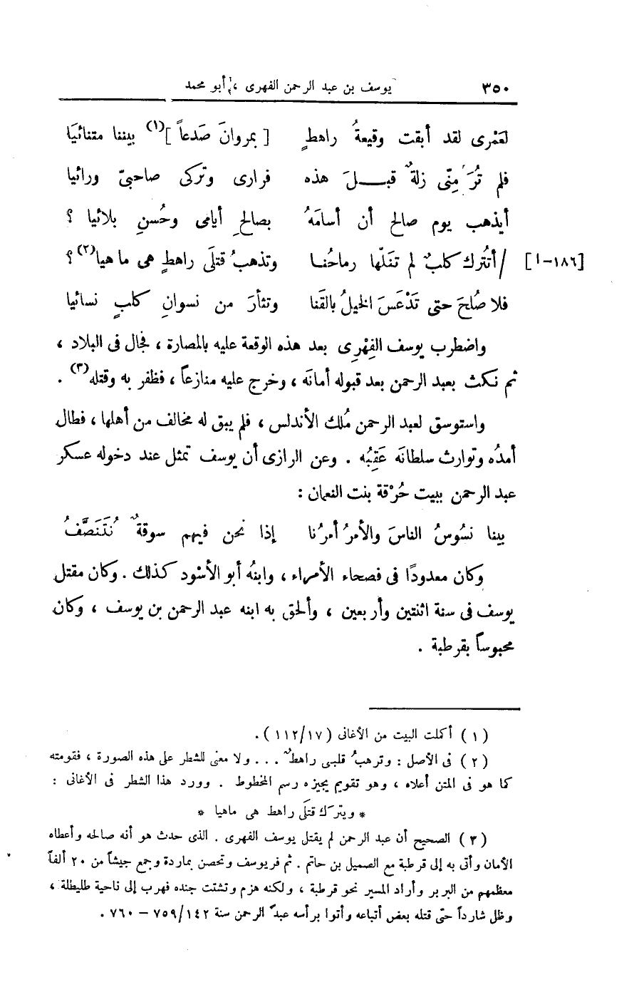 واستوسق لعبد الرَّحْمَن ملك الأندلس فَلم يبْق لَهُ مُخَالف من أَهلهَا فطال أمده وتوارث سُلْطَانه عقبه وَعَن الرَّازِيّ أَن يُوسُف تمثل عِنْد دُخُوله عَسْكَر عبد الرَّحْمَن بِبَيْت حرقة بنت النُّعْمَان