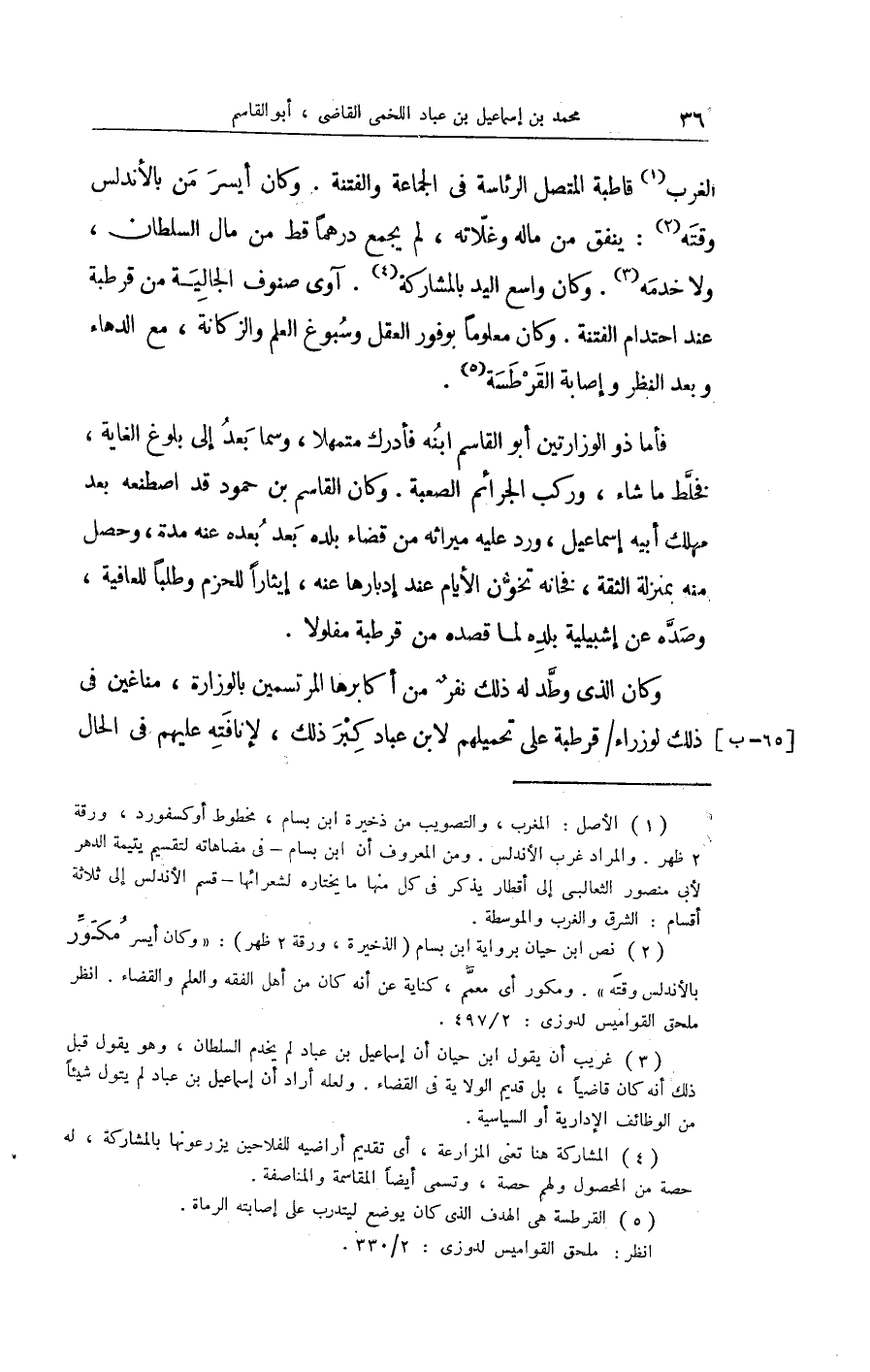 الغرب قاطبة الْمُتَّصِل الرِّئَاسَة فِي الْجَمَاعَة والفتنة وَكَانَ أيسر من بالأندلس وقته ينْفق من مَاله وغلاّته لم يجمع درهما قطّ من مَال السُّلْطَان وَلَا خدمه وَكَانَ وَاسع الْيَد بالمشاركة آوى صنوف الجالية من قرطبة عِنْد احتدام الْفِتْنَة وَكَانَ مَعْلُوما بوفور الْعقل وسبوغ الْعلم والزكانة مَعَ الدهاء وَبعد النّظر وإصابة القرطسة