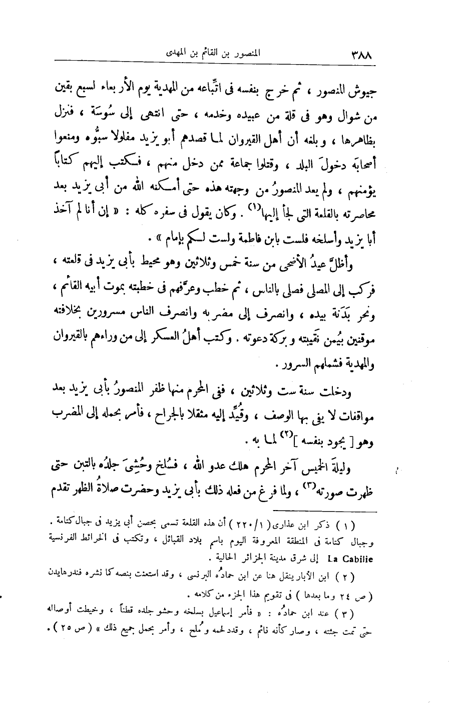وَفِي المقتبس لِابْنِ حيّان أَن النَّاصِر عبد الرَّحْمَن بن مُحَمَّد قدم عَلَيْهِ أَيُّوب ابْن أبي يزِيد الْخَارِج على المشارقة آل عبيد الله الشيعي الدعيّ الناجم بِأَرْض إفريقية رَسُولا لوالده أبي يزِيد قفيّ بِهِ رسلًا قبله يسْأَل الْقُوَّة على حَرْب هَؤُلَاءِ الْمُلْحِدِينَ المغوين للْأمة وَذَلِكَ يَوْم السبت لست بَقينَ من ربيع الأول سنة خمس وَثَلَاثِينَ فَقعدَ لَهُ النَّاصِر قعُودا فخماً وأوصله إِلَى نَفسه وَأكْرم لقاءه وَسمع مِنْهُ وأجمل الرَّد عَلَيْهِ وَأمر بإنزاله فِي قصر الرصافة وقدّامه مَا يحتفل بِهِ لأمثاله فَأَقَامَ هُنَاكَ تَحت رعي وكرامة مَوْصُولَة إِلَى أَن ورد عَلَيْهِ مِنْهَا قوم من نَاحيَة إفريقية مَعَهم رَسُول لأبي يزِيد إِلَى وَلَده أَيُّوب يذكر كرّة أبي يزِيد على المسيلة من بِلَاد إِسْمَاعِيل الْمَنْصُور حفيد أبي عبيد الشيعي الْمَذْكُور وَأَنه يتأهب للنّهود نَحوه بالقيروان وَأَنَّهُمْ بَلغهُمْ أَن أَبَا الْقَاسِم مُحَمَّد الْقَائِم بن عبيد الله بعد أَن أوصى إِلَى ابْنه فِي الْإِمَارَة هلك فِي يَوْم الْأَحَد الثَّالِث عشر من شَوَّال من هَذِه السّنة يَعْنِي سنة خمس وَثَلَاثِينَ وَولى مَكَانَهُ إِسْمَاعِيل ابْنه الملقب