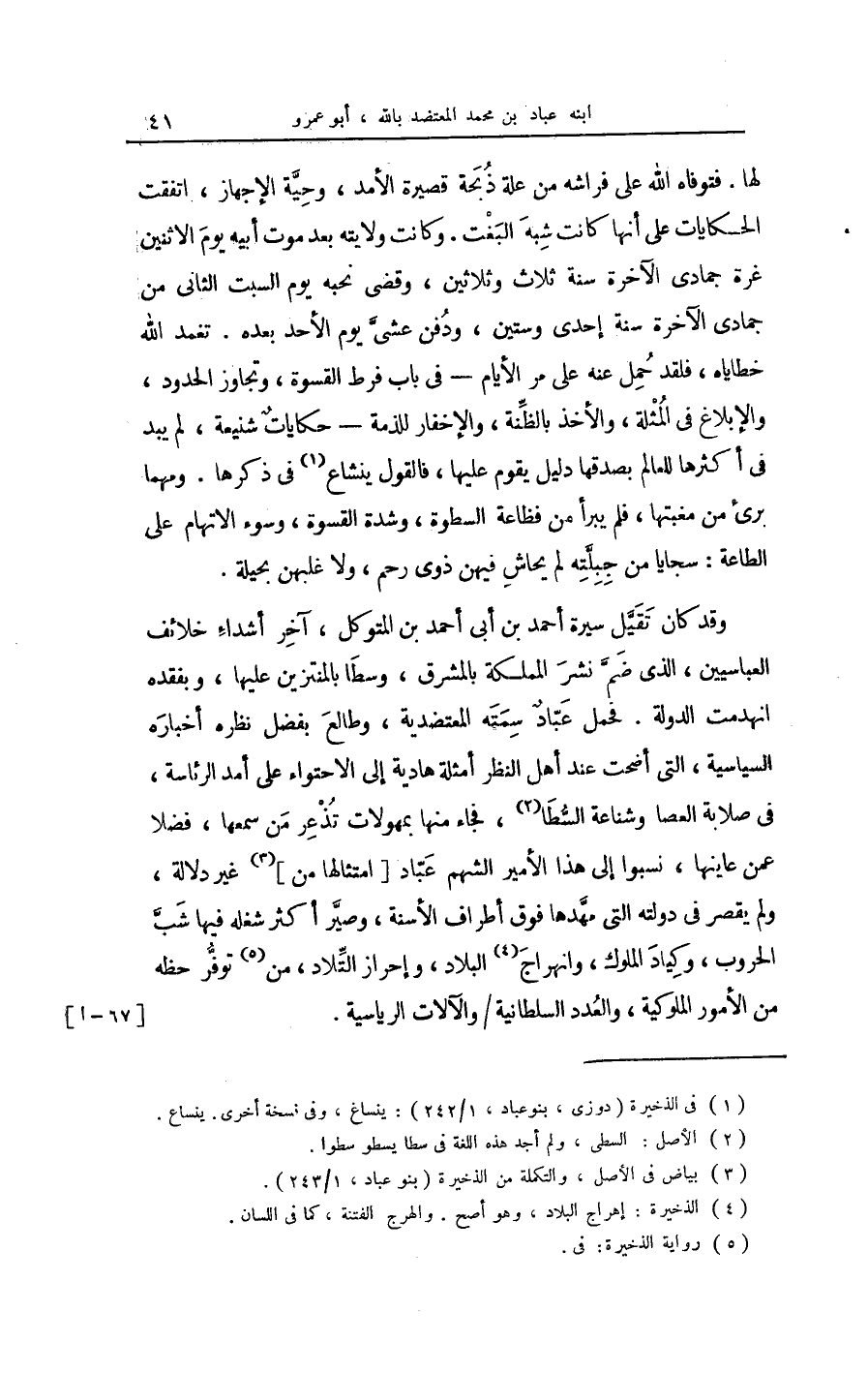 وَقد كَانَ تقيّل سيرة أحد بن أبي أَحْمد بن المتَوَكل آخر أشداء خلائف العباسيين الَّذِي ضمّ نشر المملكة بالمشرق وسطا بالمنتزين عَلَيْهَا وبفقده انْهَدَمت الدولة فَحمل عبّاد سمته المعتضدية وطالع بِفضل نظره أخباره السياسية الَّتِي أضحت عِنْد أهل النّظر أَمْثِلَة هادية إِلَى الاحتواء على أمد الرِّئَاسَة فِي صلابة الْعَصَا وشناعة السّطا فجَاء مِنْهَا بمهولات تذْعَر من سَمعهَا فضلا عَمَّن عاينها نسبوا إِلَى هَذَا الْأَمِير الشهم عبار امتثالها من غير دلَالَة وَلم يقصر فِي دولته الَّتِي مهدها فَوق أَطْرَاف الأسنة وصيرا أَكثر شغله فِيهَا شبّ الحروب وكياد الْمُلُوك وانهراج الْبِلَاد وإحراز التّلاد من توفّر حَظه من الْأُمُور الملوكية وَالْعدَد السُّلْطَانِيَّة والآلات الرياسية