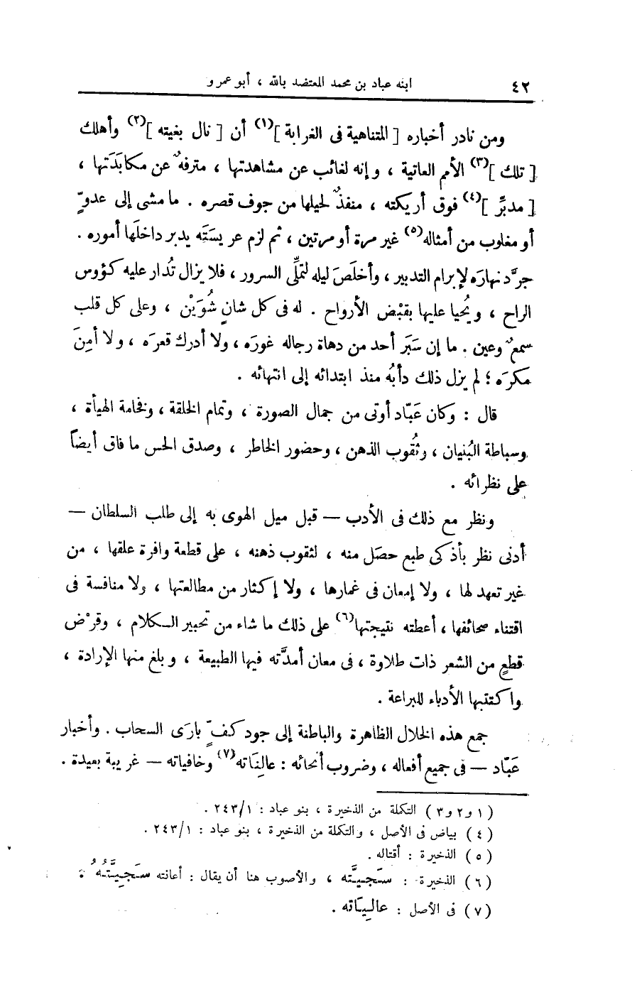 قَالَ وَكَانَ عباد أُوتى من جمال الصُّورَة وَتَمام الْخلقَة وفخامة الهيأة وسباطة الْبُنيان وثقوب الذِّهْن وَحُضُور الخاطر وَصدق الْحس مَا فاق أَيْضا على نظرائه