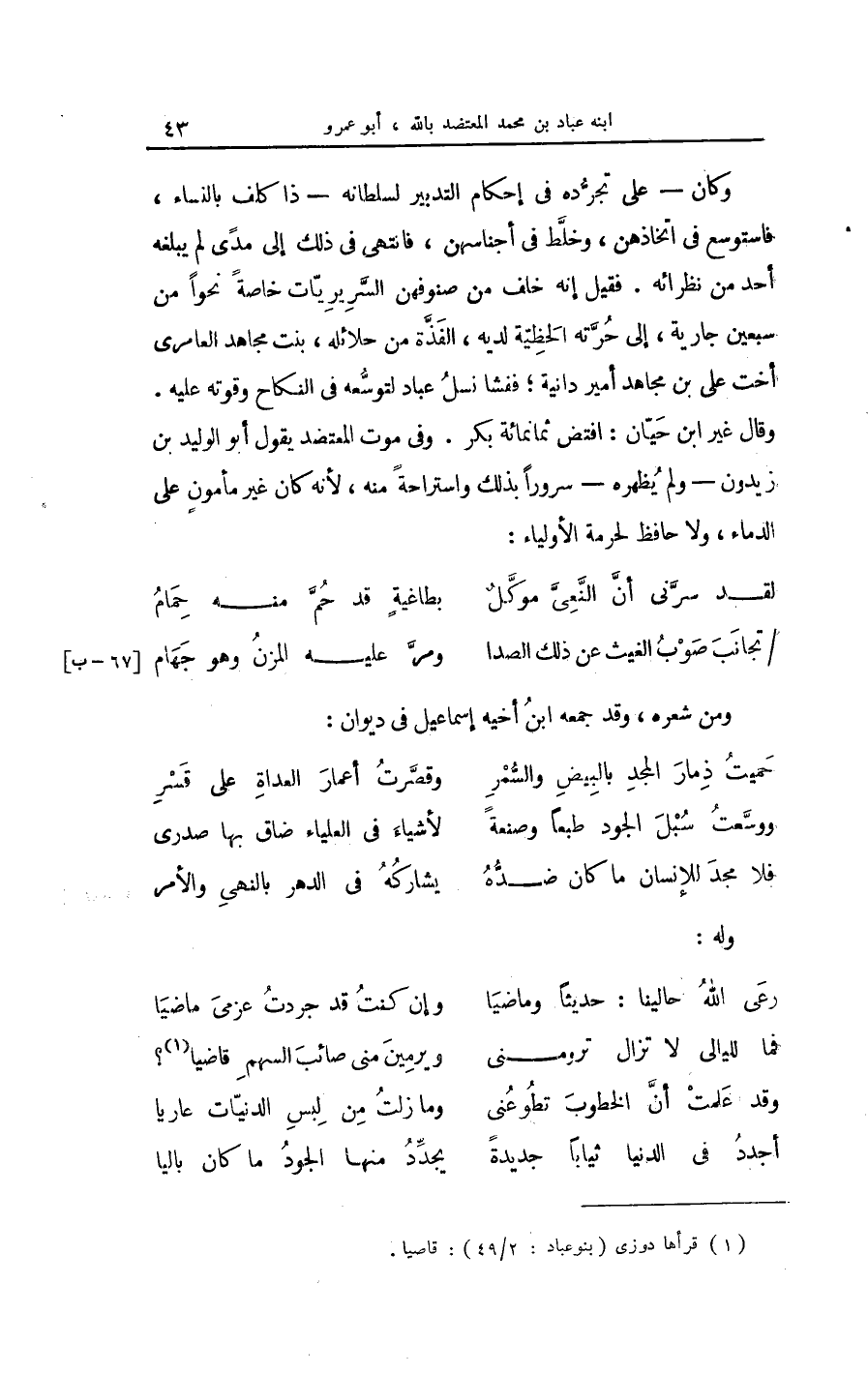 وَقَالَ غير ابْن حيّان افتض ثَمَانمِائَة بكر وَفِي موت المعتضد يَقُول أَبُو الْوَلِيد بن زيدون وَلم يظهره سُرُورًا بذلك واستراحة مِنْهُ لِأَنَّهُ كَانَ غير مَأْمُون على الدِّمَاء وَلَا حَافظ لحُرْمَة الْأَوْلِيَاء