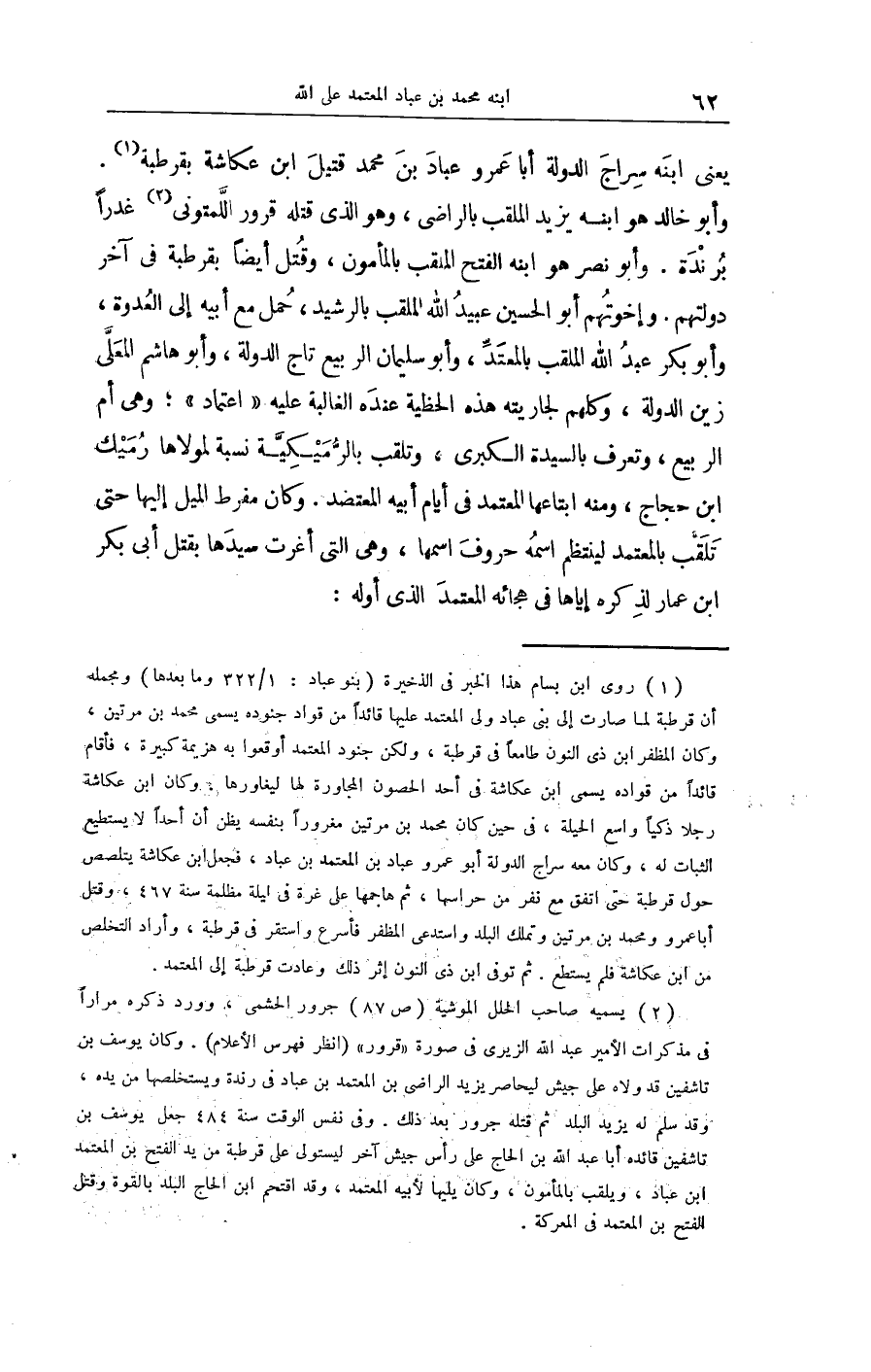 يَعْنِي ابْنه سراج الدولة أَبَا عَمْرو عباد بن مُحَمَّد قَتِيل ابْن عكاشة بقرطبة وَأَبُو خَالِد هُوَ ابْنه يزِيد الملقب بالراضي وَهُوَ الَّذِي قَتله قرور اللّمتوني غدراً برندة وَأَبُو نصر هُوَ ابْنه الْفَتْح الملقب بالمأمون وَقتل أَيْضا بقرطبة فِي آخر دولتهم وإخوتهم أَبُو الْحُسَيْن عبيد الله الملقب بالرشيد حمل مَعَ أَبِيه إِلَى العدوة وَأَبُو بكر عبد الله الملقب بالمعتدّ وَأَبُو سُلَيْمَان الرّبيع تَاج الدولة وَأَبُو هَاشم المعلّى زين الدولة وَكلهمْ لجاريته هَذِه الحظية عِنْده الْغَالِبَة عَلَيْهِ اعْتِمَاد وَهِي أم الرّبيع وتعرف بالسيدة الْكُبْرَى وتلقب بالرّميكيّة نِسْبَة لمولاها رميك ابْن حجاج وَمِنْه ابتاعها الْمُعْتَمد فِي أَيَّام أَبِيه المعتضد وَكَانَ مفرط الْميل إِلَيْهَا حَتَّى تلقّب بالمعتمد لينتظم اسْمه حُرُوف اسْمهَا وَهِي الَّتِي أغرت سَيِّدهَا بقتل أبي بكر ابْن عمار لذكره إِيَّاهَا فِي هجائه الْمُعْتَمد الَّذِي أَوله