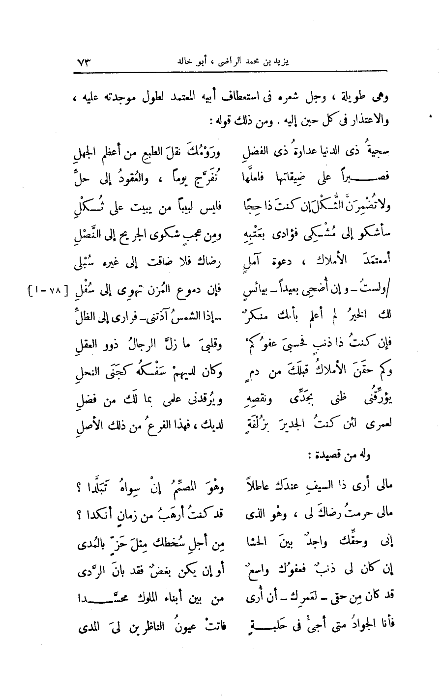 وَهِي طَوِيلَة وَجل شعره فِي استعطاف أَبِيه الْمُعْتَمد لطول موجدته عَلَيْهِ والاعتذار فِي كل حِين إِلَيْهِ وَمن ذَلِك قَوْله