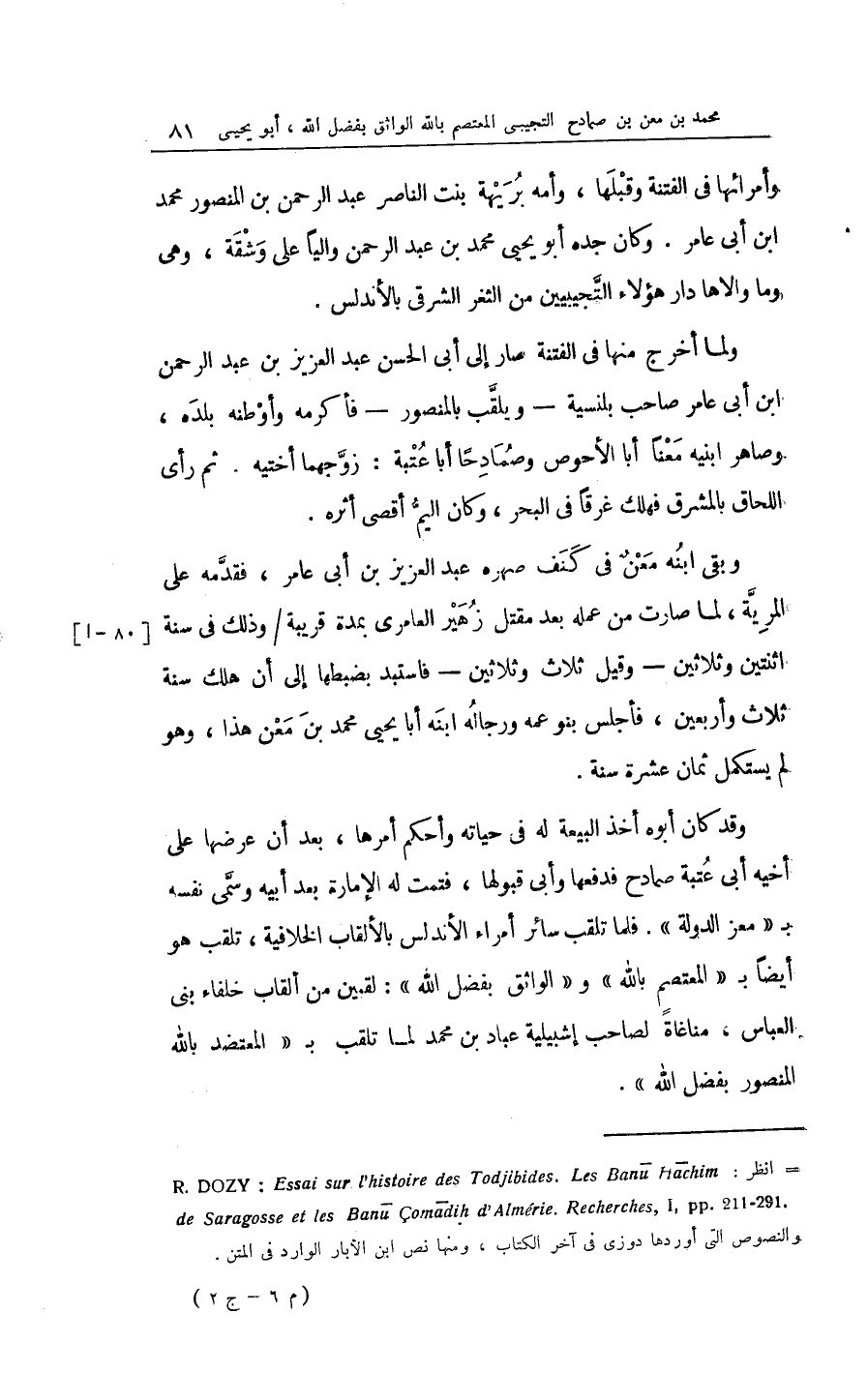 وأمرائها فِي الْفِتْنَة وَقبلهَا وَأمه بريهة بنت النَّاصِر عبد الرَّحْمَن بن الْمَنْصُور مُحَمَّد ابْن أبي عَامر وَكَانَ جده أَبُو يحيى مُحَمَّد بن عبد الرَّحْمَن والياً على وشقة وَهِي وَمَا والاها دَار هَؤُلَاءِ التّجيبيين من الثغر الشَّرْقِي بالأندلس