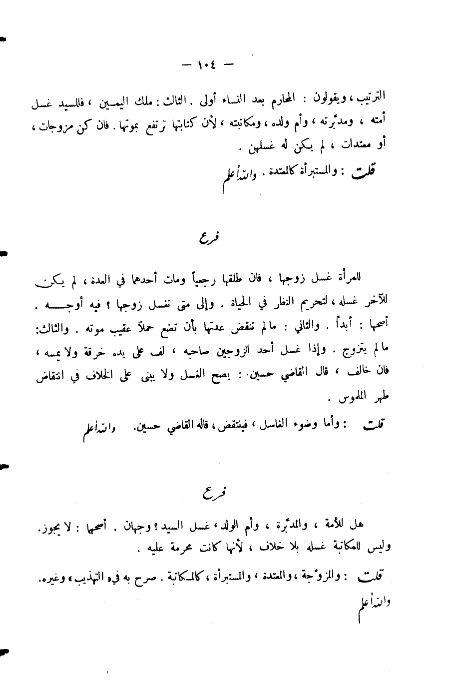 التَّرْتِيبِ، وَيَقُولُونَ: الْمَحَارِمُ بَعْدَ النِّسَاءِ أَوْلَى. الثَّالِثُ: مِلْكُ الْيَمِينِ، فَلِلسَّيِّدِ غَسْلُ أَمَتِهِ، وَمُدَبَّرَتِهِ، وَأُمِّ وَلَدِهِ، وَمُكَاتَبَتِهِ، لِأَنَّ كِتَابَتَهَا تَرْتَفِعُ بِمَوْتِهَا. فَإِنْ كُنَّ مُزَوَّجَاتٍ، أَوْ مُعْتَدَّاتٍ، لَمْ يَكُنْ لَهُ غَسْلُهُنَّ.