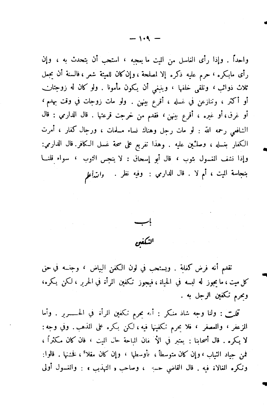 وَاحِدًا. وَإِذَا رَأَى الْغَاسِلُ مِنَ الْمَيِّتِ مَا يُعْجِبُهُ، اسْتُحِبَّ أَنْ يَتَحَدَّثَ بِهِ، وَإِنْ رَأَى مَا يَكْرَهُ، حَرُمَ عَلَيْهِ ذِكْرُهُ إِلَّا لِمَصْلَحَةٍ، وَإِذَا كَانَ لِلْمَيِّتَةِ شَعْرٌ، فَالسُّنَّةُ أَنْ يُجْعَلَ ثَلَاثَ ذَوَائِبَ، وَتُلْقَى خَلْفَهَا، وَيَنْبَغِي أَنْ يَكُونَ الْغَاسِلُ مَأْمُونًا. وَلَوْ كَانَ لَهُ زَوْجَتَانِ أَوْ أَكْثَرُ، وَتَنَازَعْنَ فِي غُسْلِهِ، أُقْرِعَ بَيْنَهُنَّ. وَلَوْ مَاتَ لَهُ زَوْجَاتٌ فِي وَقْتٍ بِهَدْمٍ، أَوْ غَرَقٍ، أَوْ غَيْرِهِ، أُقْرِعَ بَيْنَهُنَّ، فَقُدِّمَ مَنْ خَرَجَتْ قُرْعَتُهَا. قَالَ الدَّارِمِيُّ: قَالَ الشَّافِعِيُّ - رَحِمَهُ اللَّهُ -: لَوْ مَاتَ رَجُلٌ وَهُنَاكَ نِسَاءٌ مُسْلِمَاتٌ، وَرِجَالٌ كُفَّارٌ، أُمِرَتِ الْكُفَّارُ بِغَسْلِهِ، وَصَلَّيْنَ عَلَيْهِ. وَهَذَا تَفْرِيعٌ عَلَى صِحَّةِ غَسْلِ الْكَافِرِ. قَالَ الدَّارِمِيُّ: وَإِذَا نُشِّفَ الْمَغْسُولُ بِثَوْبٍ، قَالَ أَبُو إِسْحَاقَ: لَا يَنْجُسُ الثَّوْبُ، سَوَاءٌ قُلْنَا بِنَجَاسَةِ الْمَيِّتِ، أَمْ لَا. قَالَ الدَّارِمِيُّ: وَفِيهِ نَظَرٌ. - وَاللَّهُ أَعْلَمُ -.