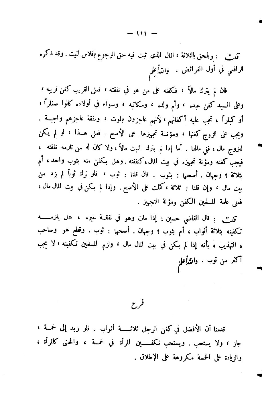 قُلْتُ: قَالَ الْقَاضِي حُسَيْنٌ: إِذَا مَاتَ وَهُوَ فِي نَفَقَةِ غَيْرِهِ، هَلْ يَلْزَمُهُ تَكْفِينُهُ بِثَلَاثَةِ أَثْوَابٍ، أَمْ بِثَوْبٍ؟ وَجْهَانِ. أَصَحُّهُمَا: ثَوْبٌ. وَقَطَعَ هُوَ وَصَاحِبُ (التَّهْذِيبِ) بِأَنَّهُ إِذَا لَمْ يَكُنْ فِي بَيْتِ الْمَالِ مَالٌ، وَلَزِمَ الْمُسْلِمِينَ تَكْفِينُهُ، لَا يَجِبُ أَكْثَرُ مِنْ ثَوْبٍ. - وَاللَّهُ أَعْلَمُ -.