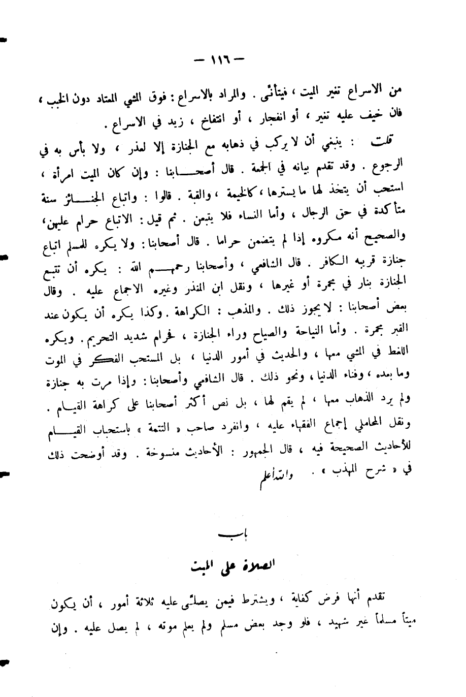 قُلْتُ: يَنْبَغِي أَنْ لَا يَرْكَبَ فِي ذَهَابِهِ مَعَ الْجِنَازَةِ إِلَّا لِعُذْرٍ، وَلَا بَأْسَ بِهِ فِي الرُّجُوعِ. وَقَدْ تَقَدَّمَ بَيَانُهُ فِي الْجُمُعَةِ. قَالَ أَصْحَابُنَا: وَإِنْ كَانَ الْمَيِّتُ امْرَأَةً، اسْتُحِبَّ أَنْ يُتَّخَذَ لَهَا مَا يَسْتُرُهَا، كَالْخَيْمَةِ، وَالْقُبَّةِ. قَالُوا: وَإِتْبَاعُ الْجَنَائِزِ سُنَّةٌ مُتَأَكَّدَةٌ فِي حَقِّ الرِّجَالِ، وَأَمَّا النِّسَاءُ فَلَا يَتْبَعْنَ. ثُمَّ قِيلَ: الِاتِّبَاعُ حَرَامٌ عَلَيْهِنَّ، وَالصَّحِيحُ أَنَّهُ مَكْرُوهٌ إِذَا لَمْ يَتَضَمَّنْ حَرَامًا. قَالَ أَصْحَابُنَا: وَلَا يُكْرَهُ لِلْمُسْلِمِ اتِّبَاعُ جِنَازَةِ قَرِيبِهِ الْكَافِرِ. قَالَ الشَّافِعِيُّ، وَأَصْحَابُنَا - رَحِمَهُمُ اللَّهُ -: يُكْرَهُ أَنْ تُتْبَعَ الْجِنَازَةُ بِنَارٍ فِي مِجْمَرَةٍ أَوْ غَيْرِهَا، وَنَقَلَ ابْنُ الْمُنْذِرِ وَغَيْرُهُ الْإِجْمَاعَ عَلَيْهِ. وَقَالَ بَعْضُ أَصْحَابِنَا: لَا يَجُوزُ ذَلِكَ. وَالْمَذْهَبُ: الْكَرَاهَةُ. وَكَذَا يُكْرَهُ أَنْ يَكُونَ عِنْدَ الْقَبْرِ مِجْمَرَةٌ. وَأَمَّا النِّيَاحَةُ وَالصِّيَاحُ وَرَاءَ الْجِنَازَةِ، فَحَرَامٌ شَدِيدُ التَّحْرِيمِ. وَيُكْرَهُ اللَّغَطُ فِي الْمَشْيِ مَعَهَا، وَالْحَدِيثُ فِي أُمُورِ الدُّنْيَا، بَلِ الْمُسْتَحَبُّ الْفِكْرُ فِي الْمَوْتِ وَمَا بَعْدَهُ، وَفَنَاءِ الدُّنْيَا، وَنَحْوِ ذَلِكَ. قَالَ الشَّافِعِيُّ وَأَصْحَابُنَا: وَإِذَا مَرَّتْ بِهِ جِنَازَةٌ وَلَمْ يُرِدِ الذَّهَابَ مَعَهَا، لَمْ يَقُمْ لَهَا، بَلْ نَصَّ أَكْثَرُ أَصْحَابِنَا عَلَى كَرَاهَةِ الْقِيَامِ. وَنَقَلَ الْمَحَامِلِيُّ إِجْمَاعَ الْفُقَهَاءِ عَلَيْهِ، وَانْفَرَدَ صَاحِبُ (التَّتِمَّةِ) بِاسْتِحْبَابِ الْقِيَامِ لِلْأَحَادِيثِ الصَّحِيحَةِ فِيهِ، قَالَ الْجُمْهُورُ: الْأَحَادِيثُ مَنْسُوخَةٌ. وَقَدْ أَوْضَحْتُ ذَلِكَ فِي (شَرْحِ الْمُهَذَّبِ) . - وَاللَّهُ أَعْلَمُ -.