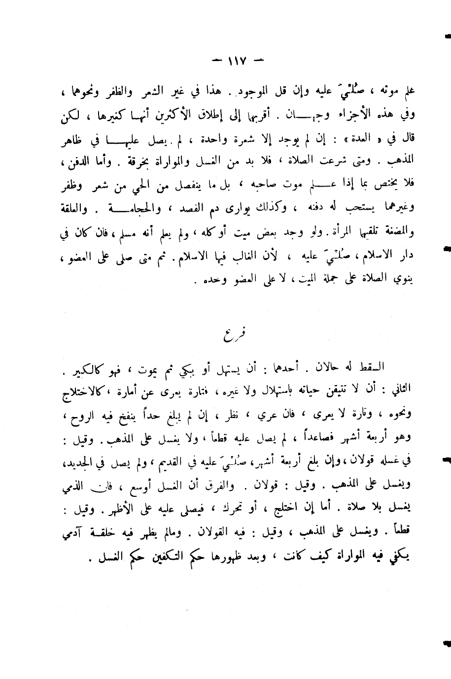 عُلِمَ مَوْتُهُ، صُلِّيَ عَلَيْهِ وَإِنْ قَلَّ الْمَوْجُودُ. هَذَا فِي غَيْرِ الشَّعْرِ وَالظُّفُرِ وَنَحْوِهِمَا، وَفِي هَذِهِ الْأَجْزَاءِ وَجْهَانِ. أَقْرَبُهُمَا إِلَى إِطْلَاقِ الْأَكْثَرِينَ أَنَّهَا كَغَيْرِهَا، لَكِنْ قَالَ فِي (الْعُدَّةِ) : إِنْ لَمْ يُوجَدْ إِلَّا شَعْرَةٌ وَاحِدَةٌ، لَمْ يُصَلَّ عَلَيْهَا فِي ظَاهِرِ الْمَذْهَبِ. وَمَتَى شُرِعَتِ الصَّلَاةُ، فَلَا بُدَّ مِنَ الْغُسْلِ وَالْمُوَارَاةِ بِخِرْقَةٍ. وَأَمَّا الدَّفْنُ، فَلَا يَخْتَصُّ بِمَا إِذَا عُلِمَ مَوْتُ صَاحِبِهِ، بَلْ مَا يَنْفَصِلُ مِنَ الْحَيِّ مِنْ شَعْرٍ وَظُفْرٍ وَغَيْرِهِمَا يُسْتَحَبُّ لَهُ دَفْنُهُ، وَكَذَلِكَ يُوَارَى دَمُ الْفَصْدِ، وَالْحِجَامَةِ. وَالْعَلَقَةُ وَالْمُضْغَةُ تُلْقِيهِمَا الْمَرْأَةُ. وَلَوْ وُجِدَ بَعْضُ مَيِّتٍ أَوْ كُلُّهُ، وَلَمْ يُعْلَمْ أَنَّهُ مُسْلِمٌ، فَإِنْ كَانَ فِي دَارِ الْإِسْلَامِ، صُلِّيَ عَلَيْهِ، لِأَنَّ الْغَالِبَ فِيهَا الْإِسْلَامُ. ثُمَّ مَتَى صَلَّى عَلَى الْعُضْوِ، يَنْوِي الصَّلَاةَ عَلَى جُمْلَةِ الْمَيِّتِ، لَا عَلَى الْعُضْوِ وَحْدَهُ.