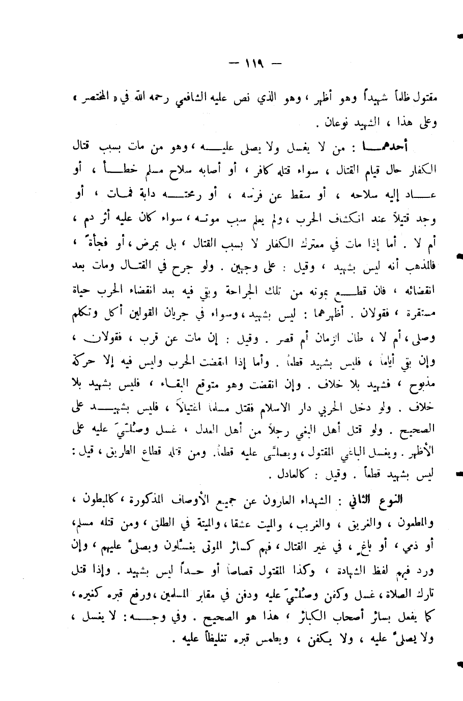 أَحَدُهُمَا: مَنْ لَا يُغَسَّلُ وَلَا يُصَلَّى عَلَيْهِ، وَهُوَ مَنْ مَاتَ بِسَبَبِ قِتَالِ الْكُفَّارِ حَالَ قِيَامِ الْقِتَالِ، سَوَاءٌ قَتَلَهُ كَافِرٌ، أَوْ أَصَابَهُ سِلَاحُ مُسْلِمٍ خَطَأً، أَوْ عَادَ إِلَيْهِ سِلَاحُهُ، أَوْ سَقَطَ عَنْ فَرَسِهِ، أَوْ رَمَحَتْهُ دَابَّةٌ فَمَاتَ، أَوْ وُجِدَ قَتِيلًا عِنْدَ انْكِشَافِ الْحَرْبِ، وَلَمْ يُعْلَمْ سَبَبُ مَوْتِهِ، سَوَاءٌ كَانَ عَلَيْهِ أَثَرُ دَمٍ، أَمْ لَا. أَمَّا إِذَا مَاتَ فِي مُعْتَرَكِ الْكُفَّارِ لَا بِسَبَبِ الْقِتَالِ، بَلْ بِمَرَضٍ، أَوْ فَجْأَةً، فَالْمَذْهَبُ أَنَّهُ لَيْسَ بِشَهِيدٍ، وَقِيلَ: عَلَى وَجْهَيْنِ. وَلَوْ جُرِحَ فِي الْقِتَالِ وَمَاتَ بَعْدَ انْقِضَائِهِ، فَإِنْ قُطِعَ بِمَوْتِهِ مِنْ تِلْكَ الْجِرَاحَةِ وَبَقِيَ فِيهِ بَعْدَ انْقِضَاءِ الْحَرْبِ حَيَاةٌ مُسْتَقِرَّةٌ، فَقَوْلَانِ. أَظْهَرُهُمَا: لَيْسَ بِشَهِيدٍ، وَسَوَاءٌ فِي جَرَيَانِ الْقَوْلَيْنِ أَكَلَ وَتَكَلَّمَ وَصَلَّى، أَمْ لَا، طَالَ الزَّمَانُ أَمْ قَصُرَ. وَقِيلَ: إِنْ مَاتَ عَنْ قُرْبٍ، فَقَوْلَانِ، وَإِنْ بَقِيَ أَيَّامًا، فَلَيْسَ بِشَهِيدٍ قَطْعًا. وَأَمَّا إِذَا انْقَضَتِ الْحَرْبُ وَلَيْسَ فِيهِ إِلَّا حَرَكَةُ مَذْبُوحٍ، فَشَهِيدٌ بِلَا خِلَافٍ. وَإِنِ انْقَضَتْ وَهُوَ مُتَوَقَّعُ الْبَقَاءِ، فَلَيْسَ بِشَهِيدٍ بِلَا خِلَافٍ. وَلَوْ دَخَلَ الْحَرْبِيُّ دَارَ الْإِسْلَامِ فَقُتِلَ مُسْلِمًا اغْتِيَالًا، فَلَيْسَ بِشَهِيدٍ عَلَى الصَّحِيحِ. وَلَوْ قَتَلَ أَهْلُ الْبَغْيِ رَجُلًا مِنْ أَهْلِ الْعَدْلِ، غُسِّلَ وَصُلِّيَ عَلَيْهِ عَلَى الْأَظْهَرِ. وَيُغَسَّلُ الْبَاغِي الْمَقْتُولُ، وَيُصَلَّى عَلَيْهِ قَطْعًا. وَمَنْ قَتَلَهُ قُطَّاعُ الطَّرِيقِ، قِيلَ. لَيْسَ بِشَهِيدٍ قَطْعًا. وَقِيلَ: كَالْعَادِلِ.