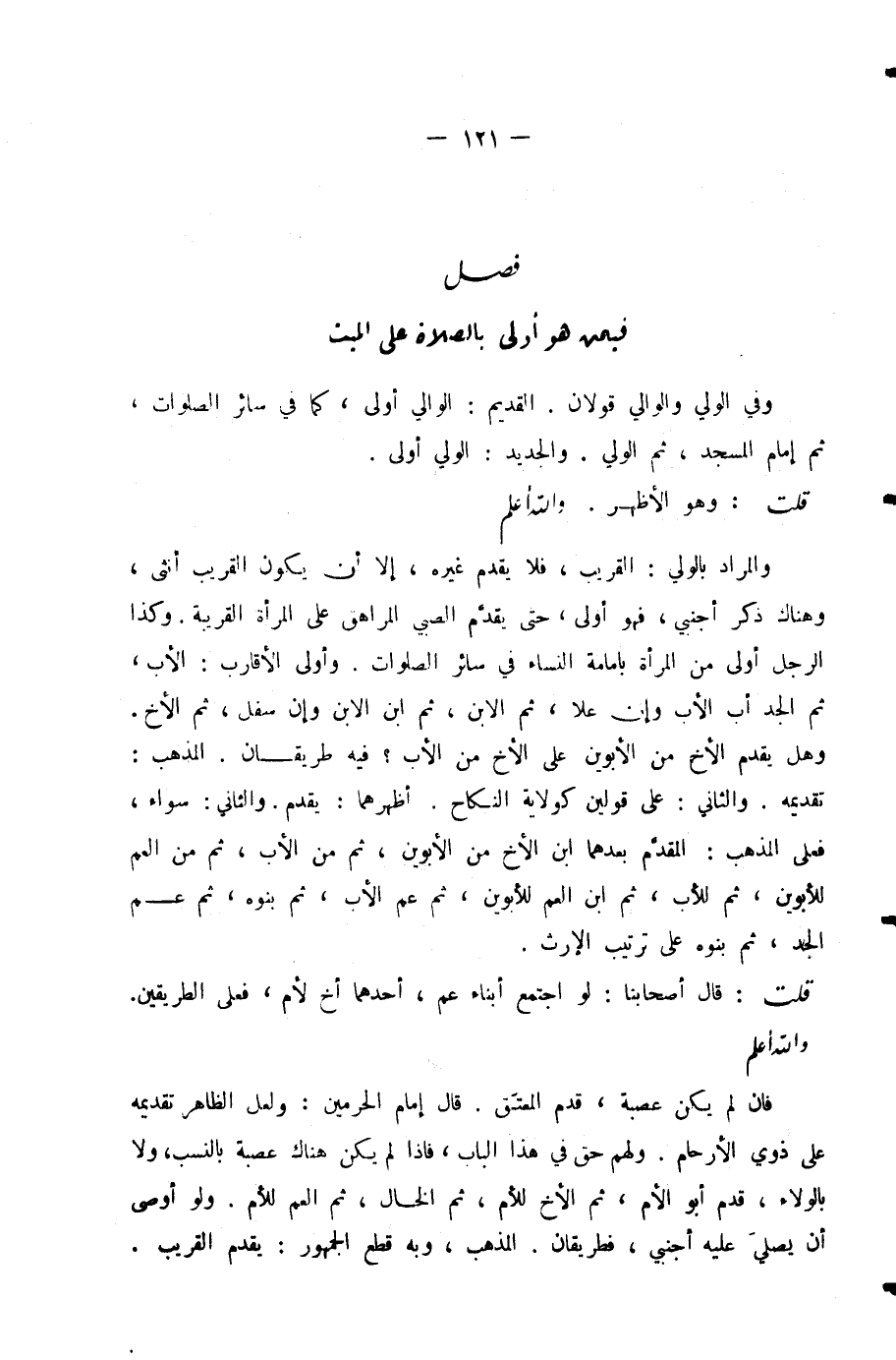 وَالْمُرَادُ بِالْوَلِيِّ: الْقَرِيبُ، فَلَا يُقَدَّمُ غَيْرُهُ، إِلَّا أَنْ يَكُونَ الْقَرِيبُ أُنْثَى، وَهُنَاكَ ذَكَرٌ أَجْنَبِيٌّ، فَهُوَ أَوْلَى، حَتَّى يُقَدَّمَ الصَّبِيُّ الْمُرَاهِقُ عَلَى الْمَرْأَةِ الْقَرِيبَةِ. وَكَذَا الرَّجُلُ أَوْلَى مِنَ الْمَرْأَةِ بِإِمَامَةِ النِّسَاءِ فِي سَائِرِ الصَّلَوَاتِ. وَأَوْلَى الْأَقَارِبِ: الْأَبُ، ثُمَّ الْجَدُّ أَبُ الْأَبِ وَإِنْ عَلَا، ثُمَّ الِابْنُ، ثُمَّ ابْنُ الِابْنِ وَإِنْ سَفُلَ، ثُمَّ الْأَخُ. وَهَلْ يُقَدَّمُ الْأَخُ مِنَ الْأَبَوَيْنِ عَلَى الْأَخِ مِنَ الْأَبِ؟ فِيهِ طَرِيقَانِ. الْمَذْهَبُ: تَقْدِيمُهُ. وَالثَّانِي: عَلَى قَوْلَيْنِ كَوِلَايَةِ النِّكَاحِ. أَظْهَرُهُمَا: يُقَدَّمُ. وَالثَّانِي: سَوَاءٌ، فَعَلَى الْمَذْهَبِ: الْمُقَدَّمُ بَعْدَهُمَا ابْنُ الْأَخِ مِنَ الْأَبَوَيْنِ، ثُمَّ مِنَ الْأَبِ، ثُمَّ مِنَ الْعَمِّ لِلْأَبَوَيْنِ، ثُمَّ لِلْأَبِ، ثُمَّ ابْنُ الْعَمِّ لِلْأَبَوَيْنِ، ثُمَّ عَمُّ الْأَبِ، ثُمَّ بَنُوهُ، ثُمَّ عَمُّ الْجَدِّ، ثُمَّ بَنُوهُ عَلَى تَرْتِيبِ الْإِرْثِ.