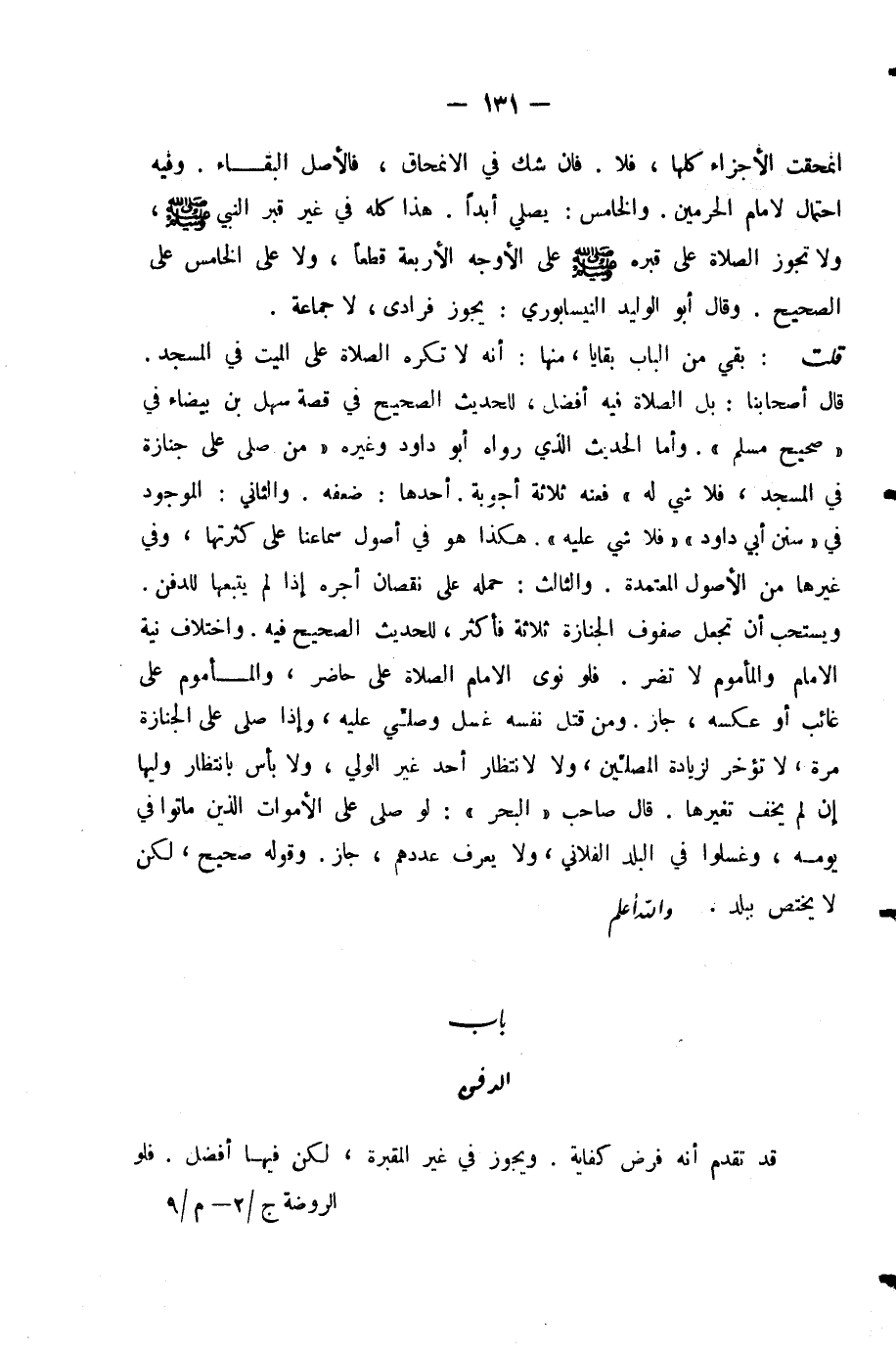 قُلْتُ: بَقِيَ مِنَ الْبَابِ بَقَايَا، مِنْهَا: أَنَّهُ لَا تُكْرَهُ الصَّلَاةُ عَلَى الْمَيِّتِ فِي الْمَسْجِدِ. قَالَ أَصْحَابُنَا: بَلِ الصَّلَاةُ فِيهِ أَفْضَلُ، لِلْحَدِيثِ الصَّحِيحِ فِي قِصَّةِ سَهْلِ بْنِ بَيْضَاءَ فِي (صَحِيحِ مُسْلِمٍ) . وَأَمَّا الْحَدِيثُ الَّذِي رَوَاهُ أَبُو دَاوُدَ وَغَيْرُهُ (مَنْ صَلَّى عَلَى جِنَازَةٍ فِي الْمَسْجِدِ، فَلَا شَيْءَ لَهُ) فَعَنْهُ ثَلَاثَةُ أَجْوِبَةٍ. أَحَدُهَا: ضَعْفُهُ. وَالثَّانِي: الْمَوْجُودُ فِي (سُنَنِ أَبِي دَاوُدَ) (فَلَا شَيْءَ عَلَيْهِ) . هَكَذَا هُوَ فِي أُصُولِ سَمَاعِنَا عَلَى كَثْرَتِهَا، وَفِي غَيْرِهَا مِنَ الْأُصُولِ الْمُعْتَمَدَةِ. وَالثَّالِثُ: حَمْلُهُ عَلَى نُقْصَانِ أَجْرِهِ إِذَا لَمْ يَتْبَعْهَا لِلدَّفْنِ. وَيُسْتَحَبُّ أَنْ تُجْعَلَ صُفُوفُ الْجِنَازَةِ ثَلَاثَةً فَأَكْثَرَ، لِلْحَدِيثِ الصَّحِيحِ فِيهِ. وَاخْتِلَافُ نِيَّةِ الْإِمَامِ وَالْمَأْمُومِ لَا تَضُرُّ. فَلَوْ نَوَى الْإِمَامُ الصَّلَاةَ عَلَى حَاضِرٍ، وَالْمَأْمُومُ عَلَى غَائِبٍ أَوْ عَكْسُهُ، جَازَ. وَمَنْ قَتَلَ نَفْسَهُ غُسِّلَ وَصُلِّيَ عَلَيْهِ، وَإِذَا صُلِّيَ عَلَى الْجِنَازَةِ مَرَّةً، لَا تُؤَخَّرُ لِزِيَادَةِ الْمُصَلِّينَ، وَلَا لِانْتِظَارِ أَحَدٍ غَيْرِ الْوَلِيِّ، وَلَا بَأْسَ بِانْتِظَارِ وَلِيِّهَا إِنْ لَمْ يُخَفْ تَغَيُّرُهَا. قَالَ صَاحِبُ (الْبَحْرِ) : لَوْ صَلَّى عَلَى الْأَمْوَاتِ الَّذِينَ مَاتُوا فِي يَوْمِهِ، وَغُسِّلُوا فِي الْبَلَدِ الْفُلَانِيِّ، وَلَا يَعْرِفُ عَدَدَهُمْ، جَازَ. وَقَوْلُهُ صَحِيحٌ، لَكِنْ لَا يُخْتَصُّ بِبَلَدٍ. - وَاللَّهُ أَعْلَمُ -.