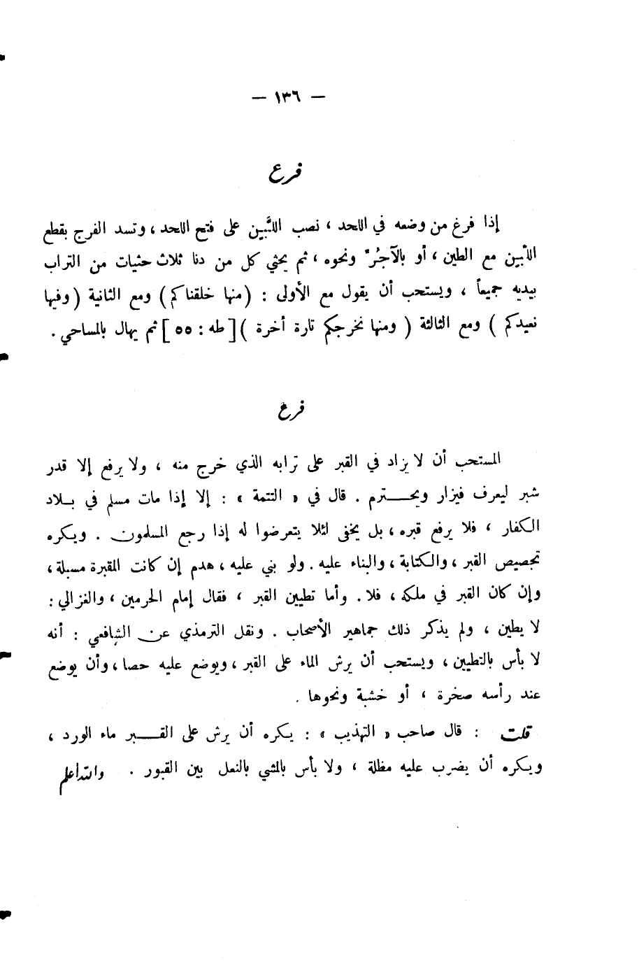 الْمُسْتَحَبُّ أَنْ لَا يُزَادَ فِي الْقَبْرِ عَلَى تُرَابِهِ الَّذِي خَرَجَ مِنْهُ، وَلَا يُرْفَعُ إِلَّا قَدْرَ شِبْرٍ لِيُعْرَفَ فَيُزَارَ وَيُحْتَرَمَ. قَالَ فِي (التَّتِمَّةِ) : إِلَّا إِذَا مَاتَ مُسْلِمٌ فِي بِلَادِ الْكُفَّارِ، فَلَا يُرْفَعُ قَبْرُهُ، بَلْ يُخْفَى لِئَلَّا يَتَعَرَّضُوا لَهُ إِذَا رَجَعَ الْمُسْلِمُونَ. وَيُكْرَهُ تَجْصِيصُ الْقَبْرِ، وَالْكِتَابَةُ، وَالْبِنَاءُ عَلَيْهِ. وَلَوْ بُنِيَ عَلَيْهِ، هُدِمَ إِنْ كَانَتِ الْمَقْبَرَةُ مُسَبَّلَةً، وَإِنْ كَانَ الْقَبْرُ فِي مِلْكِهِ، فَلَا. وَأَمَّا تَطْيِينُ الْقَبْرِ، فَقَالَ إِمَامُ الْحَرَمَيْنِ، وَالْغَزَّالِيُّ: لَا يُطَيَّنُ، وَلَمْ يَذْكُرْ ذَلِكَ جَمَاهِيرُ الْأَصْحَابِ. وَنَقَلَ التِّرْمِذِيُّ عَنِ الشَّافِعِيِّ: أَنَّهُ لَا بَأْسَ بِالتَّطْيِينِ وَيُسْتَحَبُّ أَنْ يُرَشَّ الْمَاءُ عَلَى الْقَبْرِ، وَيُوضَعُ عَلَيْهِ حَصًى، وَأَنْ يُوضَعَ عِنْدَ رَأْسِهِ صَخْرَةٌ، أَوْ خَشَبَةٌ وَنَحْوُهَا.