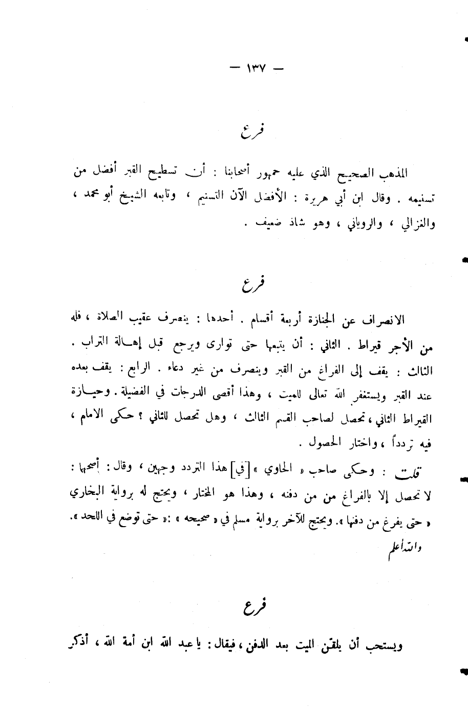 الْمَذْهَبُ الصَّحِيحُ الَّذِي عَلَيْهِ جُمْهُورُ أَصْحَابِنَا: أَنَّ تَسْطِيحَ الْقَبْرِ أَفْضَلُ مِنْ تَسْنِيمِهِ. وَقَالَ ابْنُ أَبِي هُرَيْرَةَ: الْأَفْضَلُ الْآنَ التَّسْنِيمُ، وَتَابَعَهُ الشَّيْخُ أَبُو مُحَمَّدٍ، وَالْغَزَّالِيُّ، وَالرُّويَانِيُّ، وَهُوَ شَاذٌّ ضَعِيفٌ.