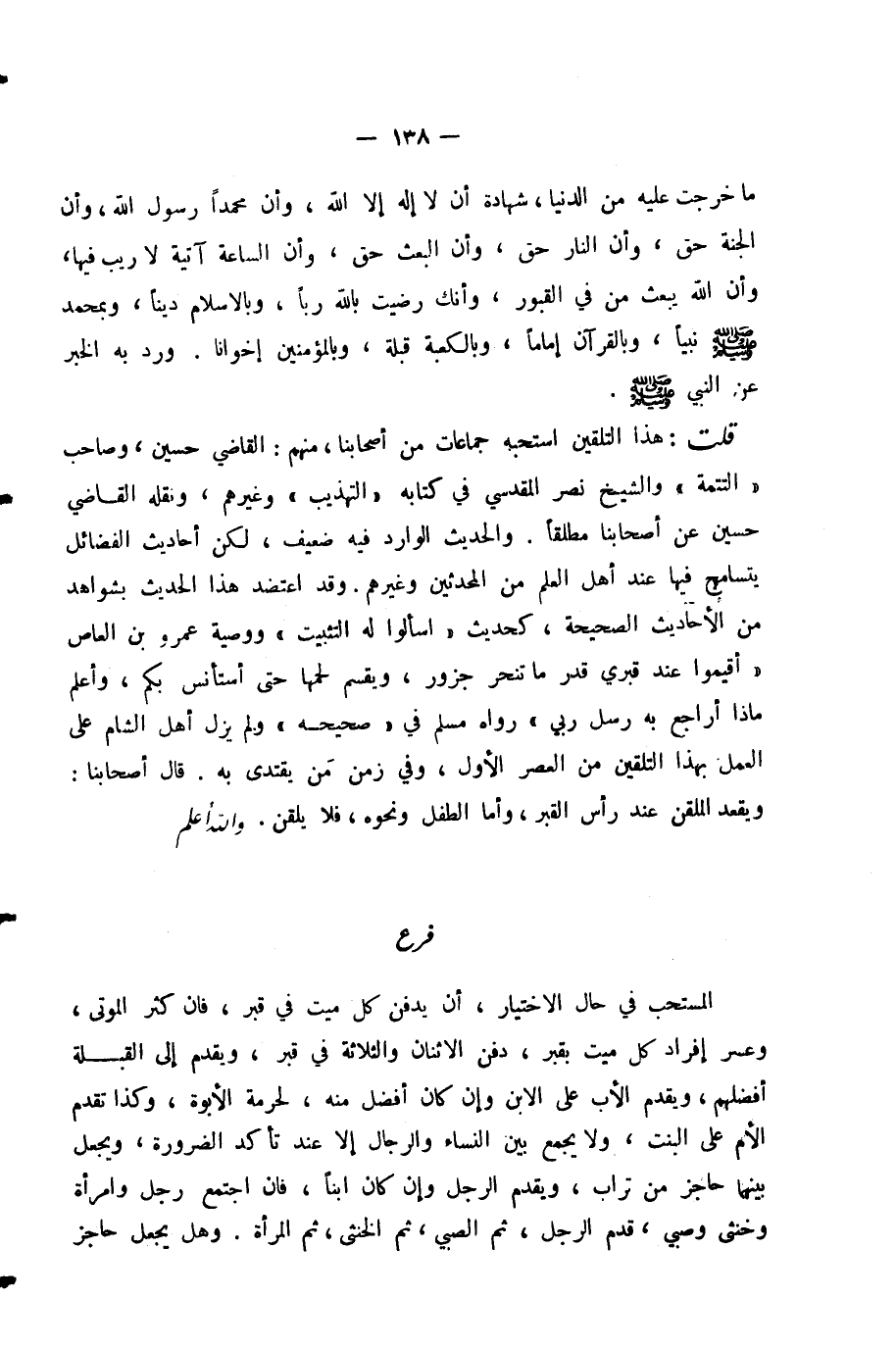 قُلْتُ: هَذَا التَّلْقِينُ اسْتَحَبَّهُ جَمَاعَاتٌ مِنْ أَصْحَابِنَا، مِنْهُمُ: الْقَاضِي حُسَيْنٌ، وَصَاحِبُ (التَّتِمَّةِ) وَالشَّيْخُ نَصْرٌ الْمَقْدِسِيُّ فِي كِتَابِهِ (التَّهْذِيبِ) وَغَيْرُهُمْ، وَنَقَلَهُ الْقَاضِي حُسَيْنٌ عَنْ أَصْحَابِنَا مُطْلَقًا. وَالْحَدِيثُ الْوَارِدُ فِيهِ ضَعِيفٌ، لَكِنَّ أَحَادِيثَ الْفَضَائِلِ يُتَسَامَحُ فِيهَا عِنْدَ أَهْلِ الْعِلْمِ مِنَ الْمُحَدِّثِينَ وَغَيْرِهِمْ. وَقَدِ اعْتُضِدَ هَذَا الْحَدِيثُ بِشَوَاهِدَ مِنَ الْأَحَادِيثِ الصَّحِيحَةِ، كَحَدِيثِ (اسْأَلُوا اللَّهَ لَهُ التَّثْبِيتَ) وَوَصِيَّةُ عَمْرِو بْنِ الْعَاصِ (أَقِيمُوا عِنْدَ قَبْرِي قَدْرَ مَا تُنْحَرُ جَزُورٌ، وَيُقَسَّمُ لَحْمُهَا حَتَّى أَسْتَأْنِسَ بِكُمْ، وَأَعْلَمَ مَاذَا أُرَاجِعُ بِهِ رُسُلَ رَبِّي) رَوَاهُ مُسْلِمٌ فِي (صَحِيحِهِ) وَلَمْ يَزَلْ أَهْلُ الشَّامِ عَلَى الْعَمَلِ بِهَذَا التَّلْقِينِ مِنَ الْعَصْرِ الْأَوَّلِ، وَفِي زَمَنِ مَنْ يُقْتَدَى بِهِ. قَالَ أَصْحَابُنَا: وَيَقْعُدُ الْمُلَقِّنُ عِنْدَ رَأْسِ الْقَبْرِ، وَأَمَّا الطِّفْلُ وَنَحْوُهُ، فَلَا يُلَقَّنُ. - وَاللَّهُ أَعْلَمُ -.