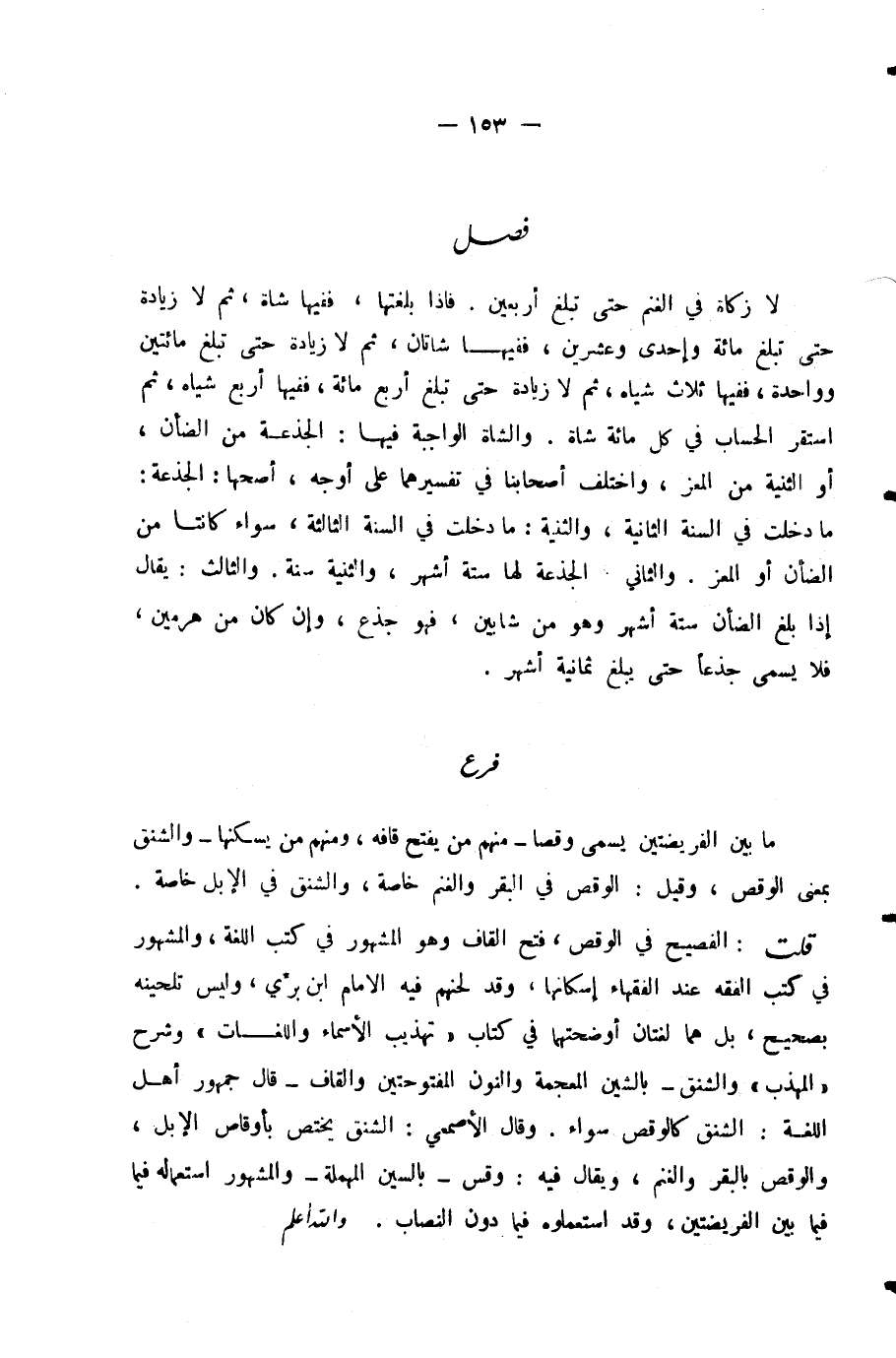 لَا زَكَاةَ فِي الْغَنَمِ، حَتَّى تَبْلُغَ أَرْبَعِينَ. فَإِذَا بَلَغَتْهَا، فَفِيهَا شَاةٌ، ثُمَّ لَا زِيَادَةَ حَتَّى تَبْلُغَ مِائَةً وَإِحْدَى وَعِشْرِينَ، فَفِيهَا شَاتَانِ، ثُمَّ لَا زِيَادَةَ حَتَّى تَبْلُغَ مِائَتَيْنِ وَوَاحِدَةً، فَفِيهَا ثَلَاثُ شِيَاهٍ، ثُمَّ لَا زِيَادَةَ حَتَّى تَبْلُغَ أَرْبَعَ مِائَةٍ، فَفِيهَا أَرْبَعُ شِيَاهٍ، ثُمَّ اسْتَقَرَّ الْحِسَابُ فِي كُلِّ مِائَةٍ شَاةٌ. وَالشَّاةُ الْوَاجِبَةُ فِيهَا: الْجَذَعَةُ مِنَ الضَّأْنِ، أَوِ الثَّنِيَّةُ مِنَ الْمَعْزِ، وَاخْتَلَفَ أَصْحَابُنَا فِي تَفْسِيرِهِمَا عَلَى أَوْجُهٍ، أَصَحُّهَا: الْجَذَعَةُ: مَا دَخَلَتْ فِي السَّنَةِ الثَّانِيَةِ، وَالثَّنِيَّةُ: مَا دَخَلَتْ فِي السَّنَةِ الثَّالِثَةِ، سَوَاءٌ كَانَتَا مِنَ الضَّأْنِ أَوِ الْمَعْزِ. وَالثَّانِي: الْجَذَعَةُ لَهَا سِتَّةُ أَشْهُرٍ، وَالثَّنِيَّةُ سَنَةٌ. وَالثَّالِثُ: يُقَالُ إِذَا بَلَغَ الضَّأْنُ سِتَّةَ أَشْهُرٍ وَهُوَ مِنْ شَابَّيْنِ، فَهُوَ جَذَعٌ، وَإِنْ كَانَ مِنْ هَرِمَيْنِ، فَلَا يُسَمَّى جَذَعًا حَتَّى يَبْلُغَ ثَمَانِيَةَ أَشْهُرٍ.