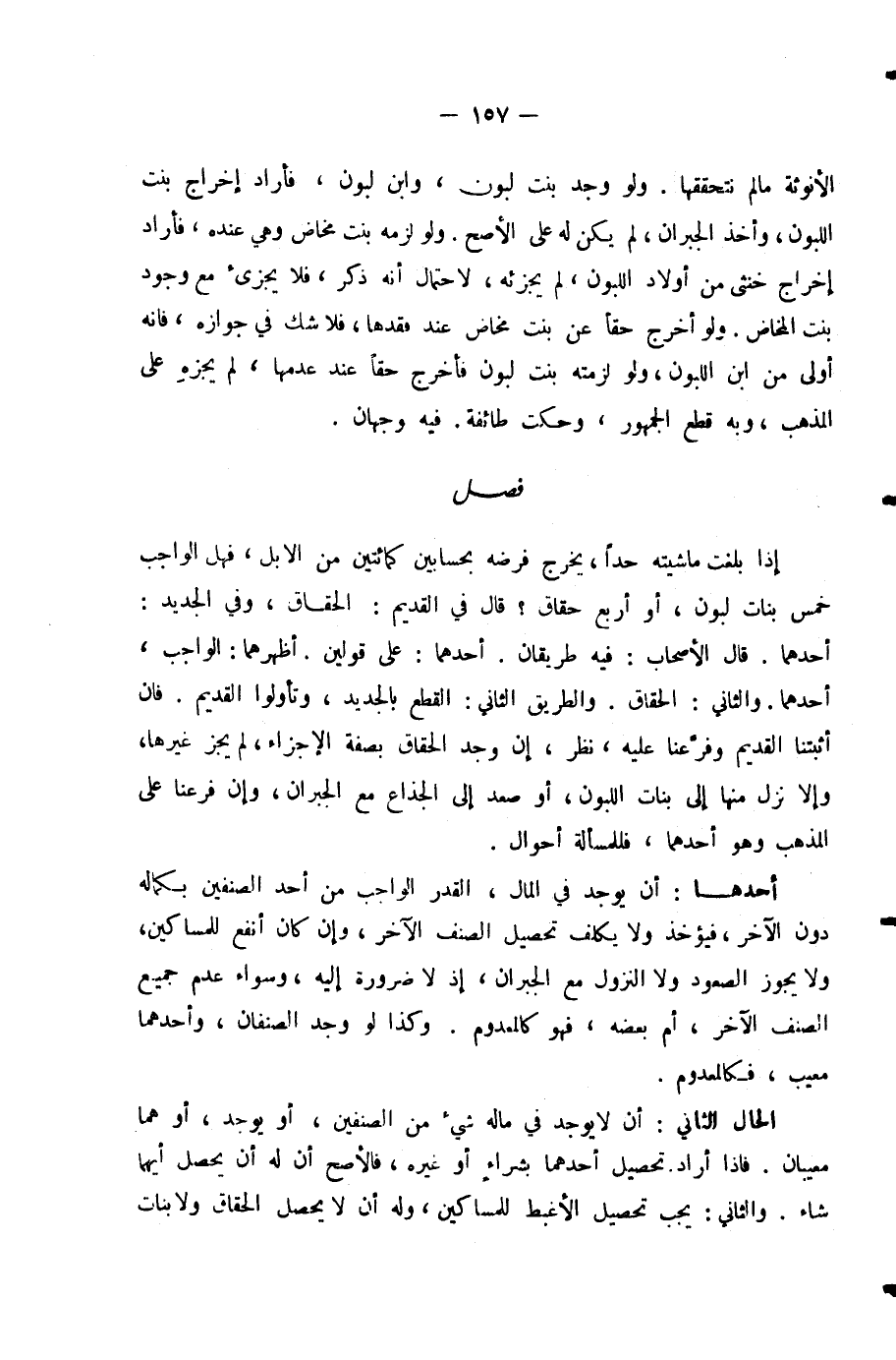 إِذَا بَلَغَتْ مَاشِيَتُهُ حَدًّا يُخْرِجُ فَرْضَهُ بِحِسَابَيْنِ كَمِائَتَيْنِ مِنَ الْإِبِلِ، فَهَلِ الْوَاجِبُ خَمْسُ بَنَاتِ لَبُونٍ، أَوْ أَرْبَعُ حِقَاقٍ؟ قَالَ فِي الْقَدِيمِ: الْحِقَاقُ، وَفِي الْجَدِيدِ: أَحَدُهُمَا. قَالَ الْأَصْحَابُ: فِيهِ طَرِيقَانِ، أَحَدُهُمَا: عَلَى قَوْلَيْنِ. أَظْهَرُهُمَا: الْوَاجِبُ أَحَدُهُمَا. وَالثَّانِي: الْحِقَاقُ. وَالطَّرِيقُ الثَّانِي: الْقَطْعُ بِالْجَدِيدِ، وَتَأَوَّلُوا الْقَدِيمَ. فَإِنْ أَثْبَتْنَا الْقَدِيمَ وَفَرَّعْنَا عَلَيْهِ، نُظِرَ، إِنْ وُجِدَ الْحِقَاقُ بِصِفَةِ الْإِجْزَاءِ لَمْ يُجْزِ غَيْرُهَا، وَإِلَّا نَزَلَ مِنْهَا إِلَى بَنَاتِ اللَّبُونِ، أَوْ صَعِدَ إِلَى الْجِذَاعِ مَعَ الْجُبْرَانِ، وَإِنْ فَرَّعْنَا عَلَى الْمَذْهَبِ وَهُوَ أَحَدُهُمَا، فَلِلْمَسْأَلَةِ أَحْوَالٌ.
