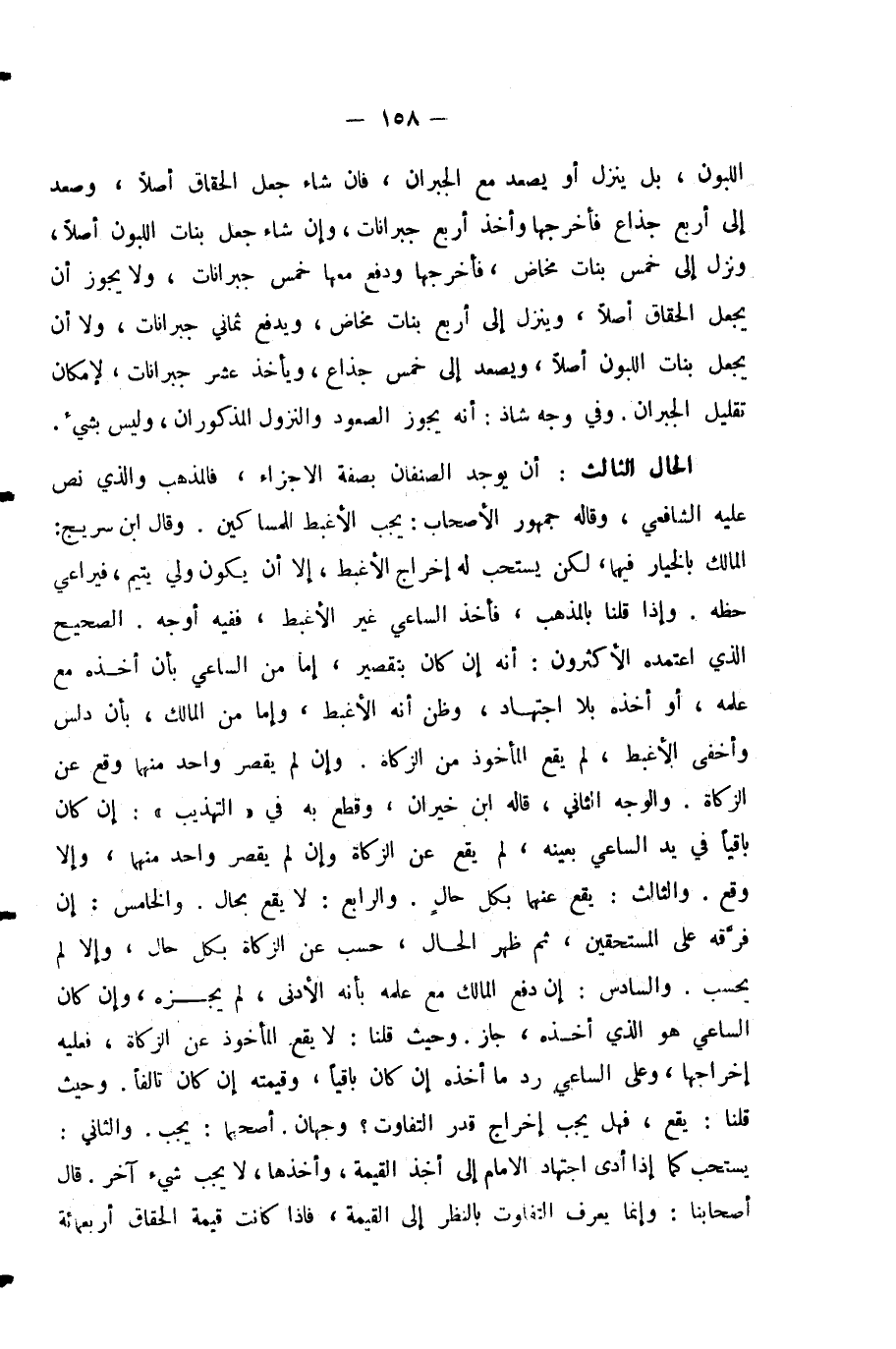 اللَّبُونِ، بَلْ يَنْزِلُ أَوْ يَصْعَدُ مَعَ الْجُبْرَانِ، فَإِنْ شَاءَ جَعَلَ الْحِقَاقَ أَصْلًا، وَصَعِدَ إِلَى أَرْبَعِ جِذَاعٍ فَأَخْرَجَهَا وَأَخَذَ أَرْبَعَ جُبْرَانَاتٍ، وَإِنْ شَاءَ جَعَلَ بَنَاتِ اللَّبُونِ أَصْلًا وَنَزَلَ إِلَى خَمْسِ بَنَاتِ مَخَاضٍ، فَأَخْرَجَهَا وَدَفَعَ مَعَهَا خَمْسَ جُبْرَانَاتٍ، وَلَا يَجُوزُ أَنْ يَجْعَلَ الْحِقَاقَ أَصْلًا وَيَنْزِلَ إِلَى أَرْبَعِ بَنَاتِ مَخَاضٍ وَيَدْفَعَ ثَمَانِيَ جُبْرَانَاتٍ، وَلَا أَنْ يَجْعَلَ بَنَاتِ اللَّبُونِ أَصْلًا وَيَصْعَدَ إِلَى خَمْسِ جِذَاعٍ وَيَأْخُذَ عَشْرَ جُبْرَانَاتٍ؛ لِإِمْكَانِ تَقْلِيلِ الْجُبْرَانِ. وَفِي وَجْهٍ شَاذٍّ أَنَّهُ يَجُوزُ الصُّعُودُ وَالنُّزُولُ الْمَذْكُورَانِ، وَلَيْسَ بِشَيْءٍ.