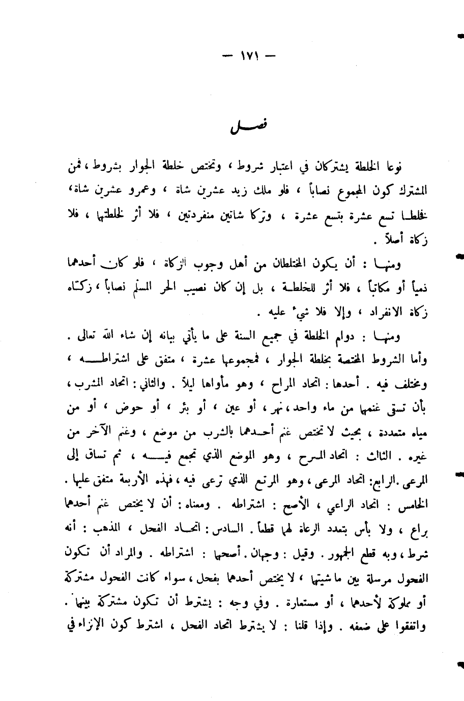 وَأَمَّا الشُّرُوطُ الْمُخْتَصَّةُ بِخُلْطَةِ الْجِوَارِ، فَمَجْمُوعُهَا عَشْرَةٌ، مُتَّفَقٌ عَلَى اشْتِرَاطِهِ، وَمُخْتَلِفٌ فِيهِ. أَحَدُهَا: اتِّحَادُ الْمَرَاحِ، وَهُوَ مَأْوَاهَا لَيْلًا. وَالثَّانِي: اتِّحَادُ الْمَشْرَبِ، بِأَنْ تُسْقَى غَنَمُهُمَا مِنْ مَاءٍ وَاحِدٍ: نَهْرٍ، أَوْ عَيْنٍ، أَوْ بِئْرٍ، أَوْ حَوْضٍ، أَوْ مِنْ مِيَاهٍ مُتَعَدِّدَةٍ، بِحَيْثُ لَا تَخْتَصُّ غَنَمُ أَحَدِهِمَا بِالشُّرْبِ مِنْ مَوْضِعٍ وَغَنَمُ الْآخَرِ مِنْ غَيْرِهِ. الثَّالِثُ: اتِّحَادُ الْمَسْرَحِ، وَهُوَ الْمَوْضِعُ الَّذِي تُجْمَعُ فِيهِ ثُمَّ تُسَاقُ إِلَى الْمَرْعَى. الرَّابِعُ: اتِّحَادُ الْمَرْعَى، وَهُوَ الْمَرْتَعُ الَّذِي تَرْعَى فِيهِ، فَهَذِهِ الْأَرْبَعَةُ مُتَّفَقٌ عَلَيْهَا.