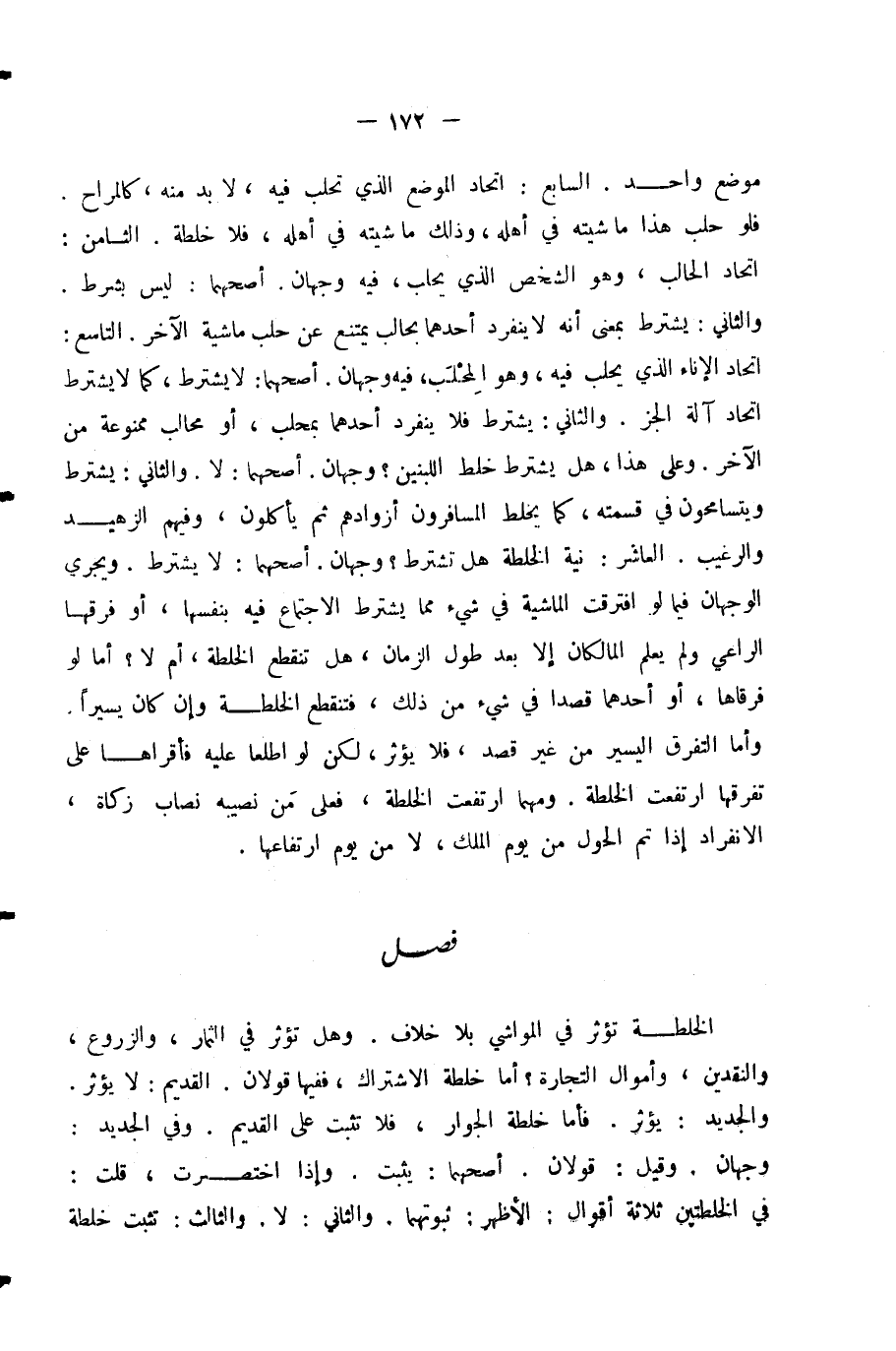 مَوْضِعٍ وَاحِدٍ. السَّابِعُ: اتِّحَادُ الْمَوْضِعِ الَّذِي تُحْلَبُ فِيهِ، لَا بُدَّ مِنْهُ، كَالْمَرَاحِ. فَلَوْ حَلَبَ هَذَا مَاشَيْتَهُ فِي أَهْلِهِ، وَذَلِكَ مَاشَيْتَهُ فِي أَهْلِهِ - فَلَا خُلْطَةَ. الثَّامِنُ: اتِّحَادُ الْحَالِبِ، وَهُوَ الشَّخْصُ الَّذِي يَحْلِبُ، فِيهِ وَجْهَانِ، أَصَحُّهُمَا: لَيْسَ بِشَرْطٍ، وَالثَّانِي: يُشْتَرَطُ بِمَعْنَى أَنَّهُ لَا يَنْفَرِدُ أَحَدُهُمَا بِحَالِبٍ يَمْتَنِعُ عَنْ حَلْبِ مَاشِيَةِ الْآخَرِ. التَّاسِعُ: اتِّحَادُ الْإِنَاءِ الَّذِي يُحْلَبُ فِيهِ، وَهُوَ الْمِحْلَبُ، فِيهِ وَجْهَانِ. أَصَحُّهُمَا: لَا يُشْتَرَطُ، كَمَا لَا يُشْتَرَطُ اتِّحَادُ آلَةِ الْجَزِّ. وَالثَّانِي: يُشْتَرَطُ فَلَا يَنْفَرِدُ أَحَدُهُمَا بِمِحْلَبٍ أَوْ مَحَالِبَ مَمْنُوعَةٍ مِنَ الْآخَرِ. وَعَلَى هَذَا هَلْ يُشْتَرَطُ خَلْطُ اللَّبَنِ؟ وَجْهَانِ، أَصَحُّهُمَا: لَا. وَالثَّانِي: يُشْتَرَطُ وَيَتَسَامَحُونَ فِي قِسْمَتِهِ، كَمَا يَخْلِطُ الْمُسَافِرُونَ أَزْوَادَهُمْ ثُمَّ يَأْكُلُونَ، وَفِيهِمُ الزَّهِيدُ وَالرَّغِيبُ. الْعَاشِرُ: نِيَّةُ الْخُلْطَةِ هَلْ تُشْتَرَطُ؟ وَجْهَانِ، أَصَحُّهُمَا: لَا يُشْتَرَطُ، وَيَجْرِي الْوَجْهَانِ فِيمَا لَوِ افْتَرَقَتِ الْمَاشِيَةُ فِي شَيْءٍ مِمَّا يُشْتَرَطُ الِاجْتِمَاعُ فِيهِ بِنَفْسِهَا، أَوْ فَرَقَّهَا الرَّاعِي وَلَمْ يَعْلَمِ الْمَالِكَانِ إِلَّا بَعْدَ طُولِ الزَّمَانِ هَلْ تَنْقَطِعُ الْخُلْطَةُ أَمْ لَا؟ أَمَّا لَوْ فَرَّقَاهَا أَوْ أَحَدَهُمَا قَصْدًا فِي شَيْءٍ مِنْ ذَلِكَ، فَتَنْقَطِعُ الْخُلْطَةُ وَإِنْ كَانَ يَسِيرًا. وَأَمَّا التَّفَرُّقُ الْيَسِيرُ مِنْ غَيْرِ قَصْدٍ فَلَا يُؤَثِّرُ، لَكِنْ لَوِ اطَّلَعَا عَلَيْهِ فَأَقَرَّاهَا عَلَى تَفَرُّقِهَا ارْتَفَعَتِ الْخُلْطَةُ. وَمَهْمَا ارْتَفَعَتِ الْخُلْطَةُ فَعَلَى مَنْ نَصِيبُهُ نِصَابُ زَكَاةٍ الِانْفِرَادُ إِذَا تَمَّ الْحَوْلُ مِنْ يَوْمِ الْمِلْكِ، لَا مِنْ يَوْمِ ارْتِفَاعِهَا.