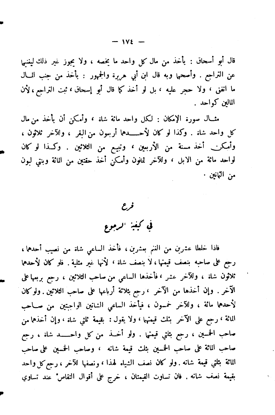 فَإِذَا خَلَطَا عِشْرِينَ مِنَ الْغَنَمِ بِعِشْرِينَ، فَأَخَذَ السَّاعِي شَاةً مِنْ نَصِيبِ أَحَدِهِمَا - رَجَعَ عَلَى صَاحِبِهِ بِنِصْفِ قِيمَتِهَا، لَا بِنِصْفِ شَاةٍ؛ لِأَنَّهَا غَيْرُ مِثْلِيَّةٍ. فَلَوْ كَانَ لِأَحَدِهِمَا ثَلَاثُونَ شَاةً وَلِلْآخَرِ عَشْرٌ، فَأَخَذَهَا السَّاعِي مِنْ صَاحِبِ الثَّلَاثِينَ - رَجَعَ بِرُبُعِهَا عَلَى الْآخَرِ. وَإِنْ أَخَذَهَا مِنَ الْآخَرِ رَجَعَ بِثَلَاثَةِ أَرْبَاعِهَا عَلَى صَاحِبِ الثَّلَاثِينَ. وَلَوْ كَانَ لِأَحَدِهِمَا مِائَةٌ وَلِلْآخَرِ خَمْسُونَ، فَيَأْخُذُ السَّاعِي الشَّاتَيْنِ الْوَاجِبَتَيْنِ مِنْ صَاحِبِ الْمِائَةِ، رَجَعَ عَلَى الْآخَرِ بِثُلُثِ قِيمَتِهِمَا، وَلَا يَقُولُ بِقِيمَةِ ثُلُثَيْ شَاةٍ، وَإِنْ أَخْذَهُمَا مِنْ صَاحِبِ الْخَمْسِينَ، رَجَعَ بِثُلُثَيْ قِيمَتِهِمَا. وَلَوْ أَخَذَ مِنْ كُلِّ وَاحِدٍ شَاةً، رَجَعَ صَاحِبُ الْمِائَةِ عَلَى صَاحِبِ الْخَمْسِينَ بِثُلُثِ قِيمَةِ شَاتِهِ، وَصَاحِبُ الْخَمْسِينَ عَلَى صَاحِبِ الْمِائَةِ بِثُلُثَيْ قِيمَةِ شَاتِهِ. وَلَوْ كَانَ نِصْفُ الشِّيَاهِ لِهَذَا وَنَصِفُهَا لِلْآخَرِ، رَجَعَ كُلُّ وَاحِدٍ بِقِيمَةِ نِصْفِ شَاتِهِ. فَإِنْ تَسَاوَتِ الْقِيمَتَانِ، خَرَجَ عَلَى أَقْوَالِ الْتَّقَاصِّ عِنْدَ تَسَاوِي