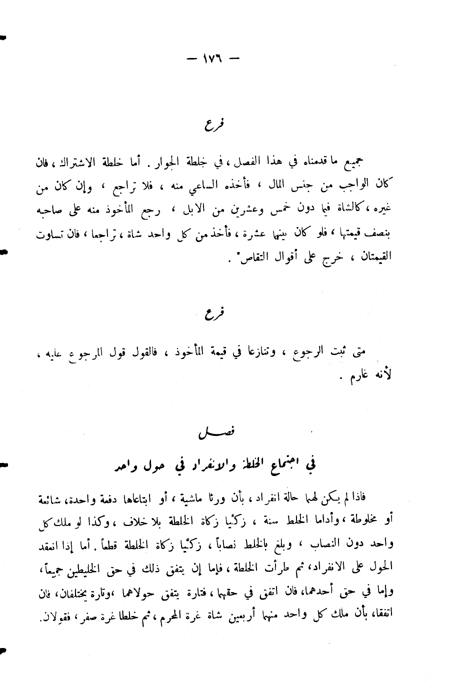 جَمِيعُ مَا قَدَّمْنَاهُ فِي هَذَا الْفَصْلِ فِي خُلْطَةِ الْجِوَارِ. أَمَّا خُلْطَةُ الِاشْتِرَاكِ، فَإِنْ كَانَ الْوَاجِبُ مِنْ جِنْسِ الْمَالِ، فَأَخْذَهُ السَّاعِي مِنْهُ، فَلَا تَرَاجُعَ، وَإِنْ كَانَ مَنْ غَيْرِهِ كَالشَّاةِ فِيمَا دُونَ خَمْسٍ وَعِشْرِينَ مِنَ الْإِبِلِ، رَجَعَ الْمَأْخُوذُ مِنْهُ عَلَى صَاحِبِهِ بِنِصْفِ قِيمَتِهَا، فَلَوْ كَانَ بَيْنَهُمَا عَشْرَةٌ، فَأَخَذَ مِنْ كُلِّ وَاحِدٍ شَاةً، تَرَاجَعًا، فَإِنْ تَسَاوَتِ الْقِيمَتَانِ، خَرَجَ عَلَى أَقْوَالِ التَّقَاصِّ.