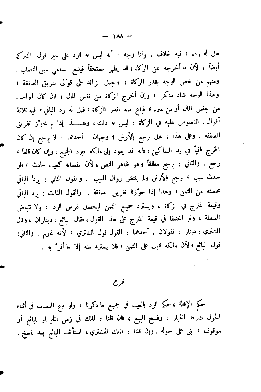 ، هَلْ لَهُ رَدُّهُ؟ فِيهِ خِلَافٌ. وَلَنَا وَجْهٌ أَنَّهُ لَيْسَ لَهُ الرَّدُّ عَلَى غَيْرِ قَوْلِ الشَّرِكَةِ أَيْضًا، لِأَنَّ مَا أَخْرَجَهُ عَنِ الزَّكَاةِ قَدْ يَظْهَرُ مُسْتَحَقًّا فَيَتَّبِعَ السَّاعِي عَيْنَ النَّصَّابِ. وَمِنْهُمْ مَنْ خَصَّ الْوَجْهَ بِقَدْرِ الزَّكَاةِ، وَجَعَلَ الزَّائِدَ عَلَى قَوْلَيْ تَفْرِيقِ الصَّفْقَةِ، وَهَذَا الْوَجْهُ شَاذٌّ مُنْكَرٌ، وَإِنْ أَخْرَجَ الزَّكَاةَ مِنْ نَفْسِ الْمَالِ، فَإِنْ كَانَ الْوَاجِبُ مِنْ جِنْسِ الْمَالِ أَوْ مِنْ غَيْرِهِ فَبَاعَ مِنْهُ بِقَدْرِ الزَّكَاةِ، فَهَلْ لَهُ رَدُّ الْبَاقِي؟ فِيهِ ثَلَاثَةُ أَقْوَالٍ، الْمَنْصُوصُ عَلَيْهِ فِي الزَّكَاةِ: لَيْسَ لَهُ ذَلِكَ، وَهَذَا إِذَا لَمْ نُجَوِّزُ تَفْرِيقَ الصَّفْقَةِ. وَعَلَى هَذَا، هَلْ يَرْجِعُ بِالْأَرْشِ؟ وَجْهَانِ.