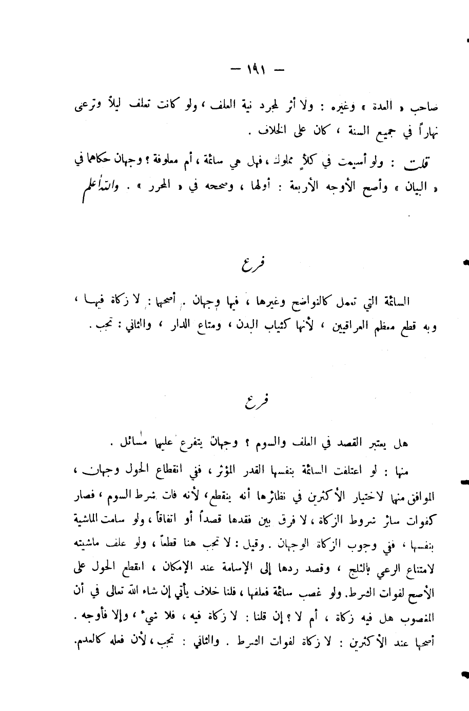 قُلْتُ: وَلَوْ أُسِيمَتْ فِي كَلَأٍ مَمْلُوكٍ، فَهَلْ هِيَ سَائِمَةٌ أَمْ مَعْلُوفَةٌ؟ وَجْهَانِ حَكَاهُمَا فِي الْبَيَانِ، وَأَصَحُّ الْأَوْجُهِ الْأَرْبَعَةِ أَوَّلُهَا، وَصَحَّحَهُ فِي الْمُحَرَّرِ، وَاللَّهُ أَعْلَمُ.