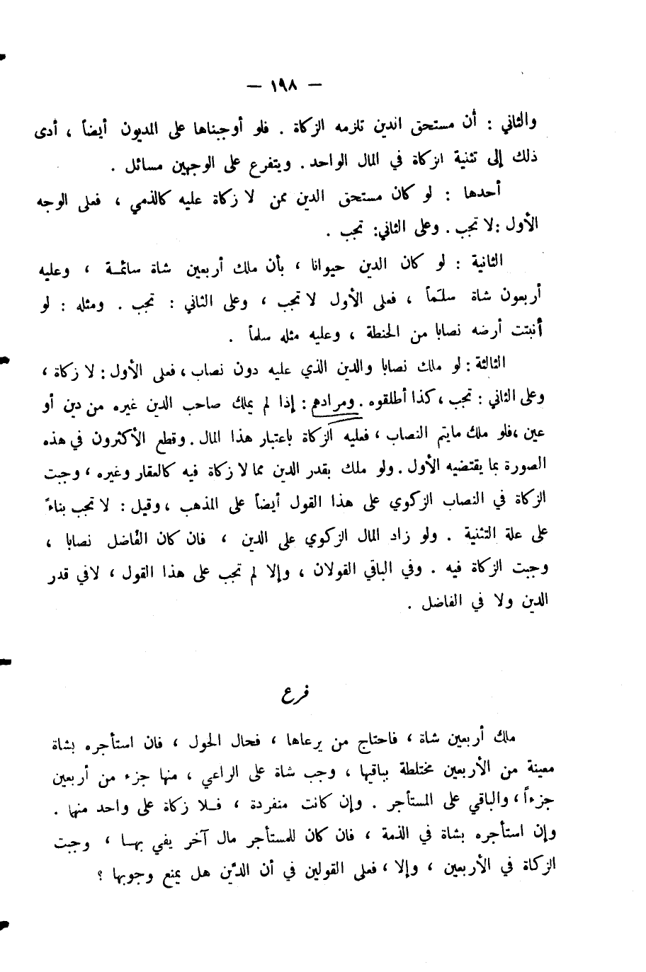 وَالثَّانِي أَنَّ مُسْتَحِقَّ الدَّيْنِ تَلْزَمُهُ الزَّكَاةُ. فَلَوْ أَوْجَبْنَاهَا عَلَى الْمَدْيُونِ أَيْضًا أَدَّى ذَلِكَ إِلَى تَثْنِيَةِ الزَّكَاةِ فِي الْمَالِ الْوَاحِدِ. وَيَتَفَرَّعُ عَلَى الْوَجْهَيْنِ مَسَائِلُ.