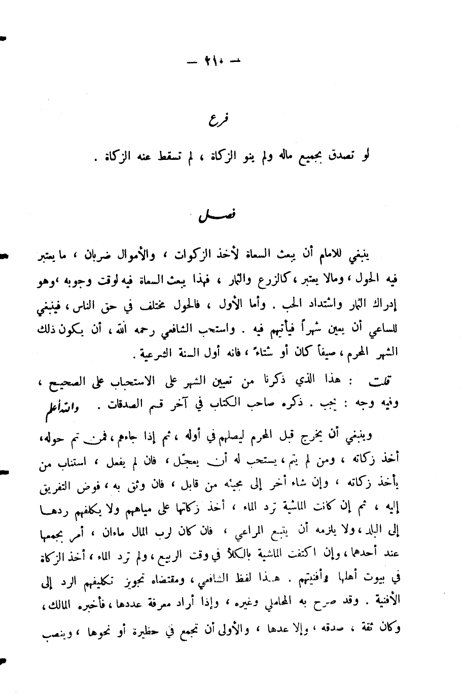 وَيَنْبَغِي أَنْ يَخْرُجَ قَبْلَ الْمُحَرَّمِ؛ لِيَصِلَهُمْ فِي أَوَّلِهِ، ثُمَّ إِذَا جَاءَهُمْ فَمَنْ تَمَّ حَوْلُهُ أَخَذَ زَكَاتَهُ، وَمَنْ لَمْ يَتِمَّ يُسْتَحَبُّ لَهُ أَنْ يُعَجِّلَ، فَإِنْ لَمْ يَفْعَلِ اسْتَنَابَ مَنْ يَأْخُذُ زَكَاتَهُ، وَإِنْ شَاءَ أَخَّرَ إِلَى مَجِيئِهِ مِنْ قَابِلٍ، فَإِنْ وَثِقَ بِهِ فَوَّضَ التَّفْرِيقَ إِلَيْهِ، ثُمَّ إِنْ كَانَتِ الْمَاشِيَةُ تَرِدُ الْمَاءَ أَخَذَ زَكَاتَهَا عَلَى مِيَاهِهِمْ، وَلَا يُكَلِّفُهُمْ رَدَّهَا إِلَى الْبَلَدِ، وَلَا يَلْزَمُهُ أَنْ يَتْبَعَ الْمَرَاعِيَ، فَإِنْ كَانَ لِرَبِّ الْمَالِ مَاءَانِ، أَمَرَ بِجَمْعِهَا عِنْدَ أَحَدِهِمَا، وَإِنِ اكْتَفَتِ الْمَاشِيَةُ بِالْكَلَأِ فِي وَقْتِ الرَّبِيعِ وَلَمْ تَرِدِ الْمَاءَ، أَخَذَ الزَّكَاةَ فِي بُيُوتِ أَهْلِهَا وَأَفْنِيَتِهِمْ. هَذَا لَفْظُ الشَّافِعِيِّ، وَمُقْتَضَاهُ تَجْوِيزُ تَكْلِيفِهِمُ الرَّدَّ إِلَى الْأَفْنِيَةِ. وَقَدْ صَرَّحَ بِهِ الْمَحَامِلِيُّ وَغَيْرُهُ، وَإِذَا أَرَادَ مَعْرِفَةَ عَدَدِهَا فَأَخْبَرَهُ الْمَالِكُ، وَكَانَ ثِقَةً، صَدَّقَهُ، وَإِلَّا عَدَّهَا، وَالْأَوْلَى أَنْ تُجْمَعَ فِي حَظِيرَةٍ أَوْ نَحْوِهَا، وَيُنْصَبَ