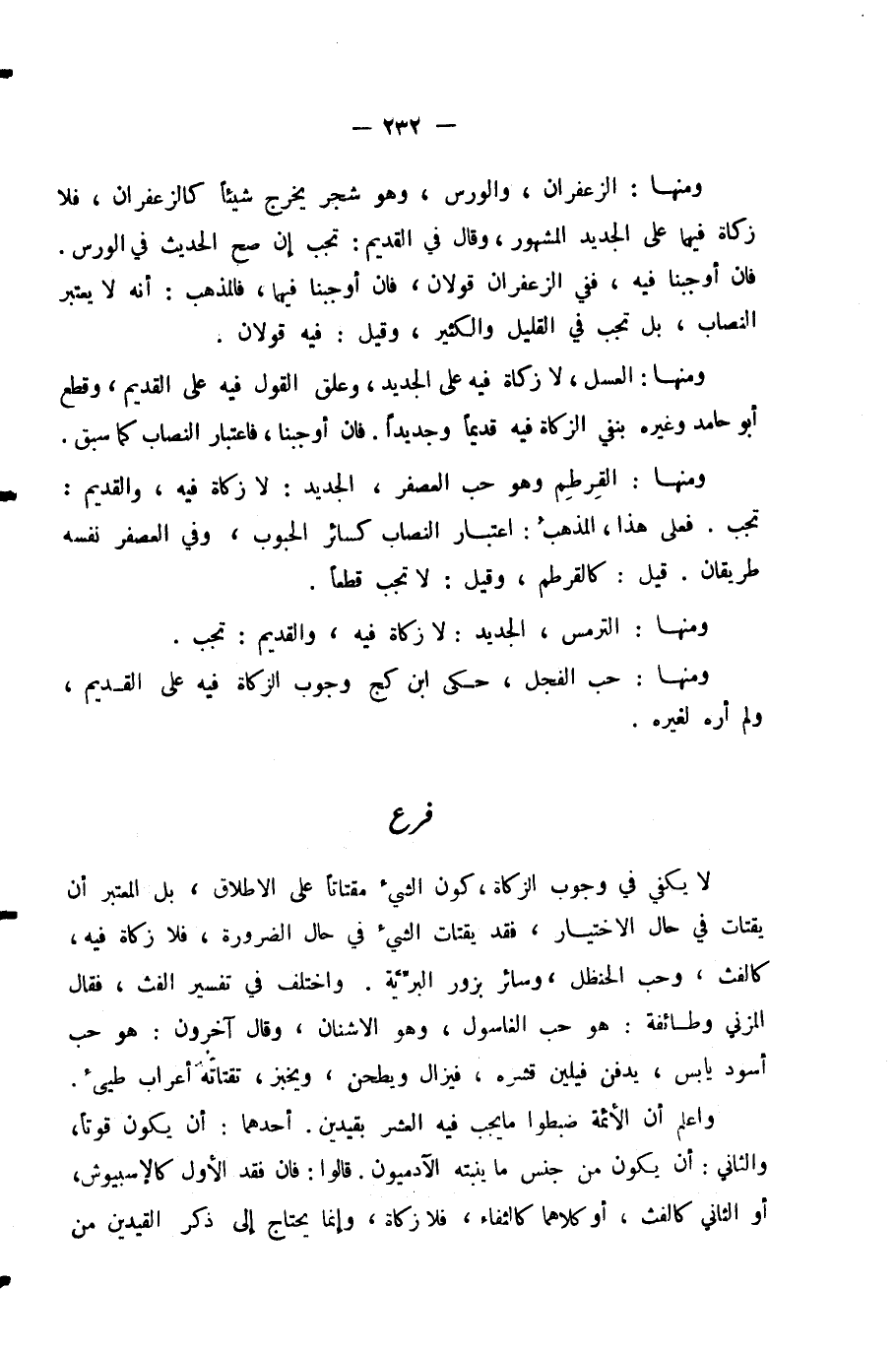 وَمِنْهَا: الزَّعْفَرَانُ، وَالْوَرْسُ وَهُوَ شَجَرٌ يُخْرِجُ شَيْئًا كَالزَّعْفَرَانِ، فَلَا زَكَاةَ فِيهِمَا عَلَى الْجَدِيدِ الْمَشْهُورِ، وَقَالَ فِي الْقَدِيمِ: تَجِبُ إِنْ صَحَّ الْحَدِيثُ فِي الْوَرْسِ. فَإِنْ أَوْجَبْنَا فِيهِ فَفِي الزَّعْفَرَانِ قَوْلَانِ، فَإِنْ أَوْجَبْنَا فِيهِمَا فَالْمَذْهَبُ: أَنَّهُ لَا يُعْتَبَرُ النِّصَابُ، بَلْ تَجِبُ فِي الْقَلِيلِ وَالْكَثِيرِ، وَقِيلَ: فِيهِ قَوْلَانِ.