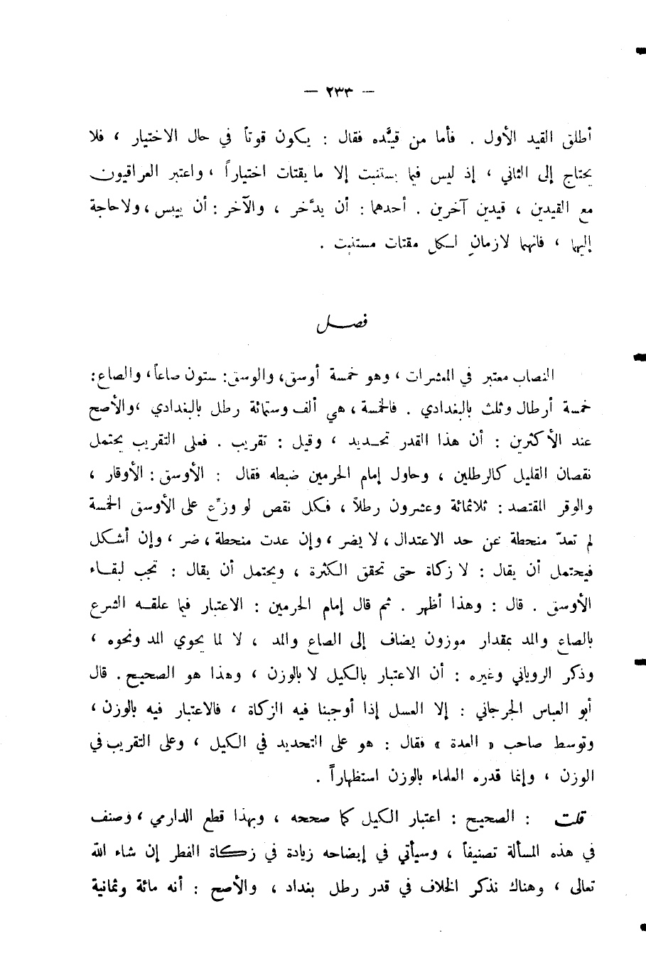 قُلْتُ: الصَّحِيحُ: اعْتِبَارُ الْكَيْلِ كَمَا صَحَّحَهُ، وَبِهَذَا قَطَعَ الدَّارِمِيُّ، وَصَنَّفَ فِي هَذِهِ الْمَسْأَلَةِ تَصْنِيفًا، وَسَيَأْتِي فِي إِيضَاحِهِ زِيَادَةٌ فِي زَكَاةِ الْفِطْرِ إِنْ شَاءَ اللَّهُ تَعَالَى، وَهُنَاكَ نَذْكُرُ الْخِلَافَ فِي قَدْرِ رِطْلِ بَغْدَادَ، وَالْأَصَحُّ أَنَّهُ مِائَةٌ وَثَمَانِيَةٌ