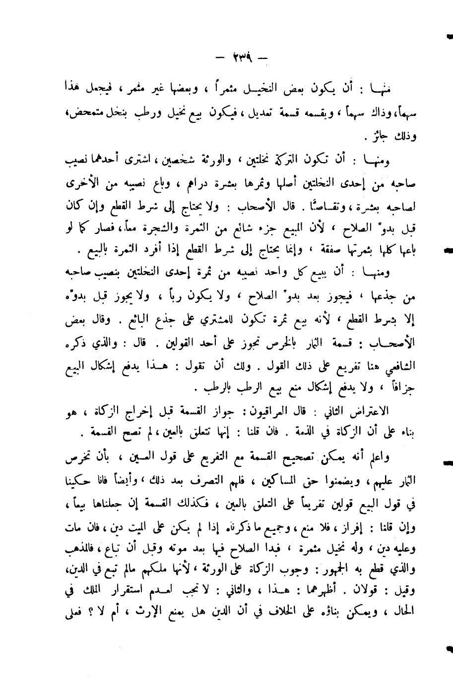 وَمِنْهَا: أَنْ تَكُونَ التَّرِكَةُ نَخْلَتَيْنِ وَالْوَرَثَةُ شَخْصَيْنِ، اشْتَرَى أَحَدُهُمَا نَصِيبَ صَاحِبِهِ مِنْ إِحْدَى النَّخْلَتَيْنِ - أَصْلُهَا وَثَمَرُهَا - بِعَشَرَةِ دَرَاهِمَ، وَبَاعَ نَصِيبَهُ مِنَ الْأُخْرَى لِصَاحِبِهِ بِعِشَرَةٍ وَتَقَاصَّا. قَالَ الْأَصْحَابُ: وَلَا يَحْتَاجُ إِلَى شَرْطِ الْقَطْعِ وَإِنْ كَانَ قَبْلَ بُدُوِّ الصَّلَاحِ؛ لِأَنَّ الْمَبِيعَ جُزْءٌ شَائِعٌ مِنَ الثَّمَرَةِ وَالشَّجَرَةِ مَعًا، فَصَارَ كَمَا لَوْ بَاعَهَا كُلَّهَا بِثَمَرَتِهَا صَفْقَةً، وَإِنَّمَا يَحْتَاجُ إِلَى شَرْطِ الْقَطْعِ إِذَا أَفْرَدَ الثَّمَرَةَ بِالْبَيْعِ.