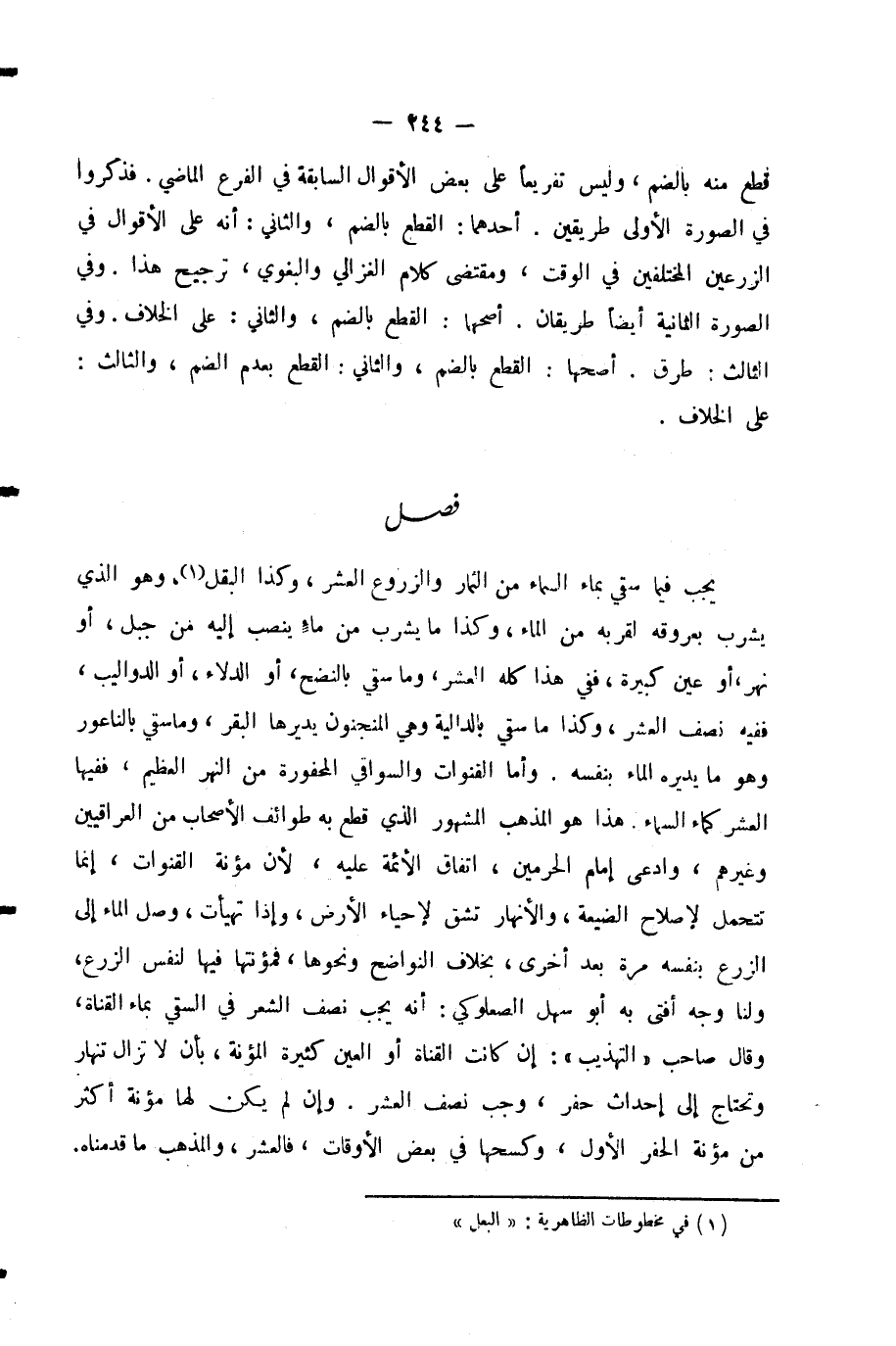 يَجِبُ فِيمَا سُقِيَ بِمَاءِ السَّمَاءِ مِنَ الثِّمَارِ وَالزُّرُوعِ الْعُشْرُ، وَكَذَا الْبَقْلُ وَهُوَ الَّذِي يَشْرَبُ بِعُرُوقِهِ لِقُرْبِهِ مِنَ الْمَاءِ، وَكَذَا مَا يَشْرَبُ مِنْ مَاءٍ يَنْصَبُّ إِلَيْهِ مِنْ جَبَلٍ أَوْ نَهْرٍ أَوْ عَيْنٍ كَبِيرَةٍ، فَفِي هَذَا كُلِّهِ الْعُشْرُ، وَمَا سُقِيَ بِالنَّضْحِ أَوِ الدِّلَاءِ أَوِ الدَّوَالِيبِ، فَفِيهِ نِصْفُ الْعُشْرِ، وَكَذَا مَا سُقِيَ بِالدَّالِيَةِ وَهِيَ الْمَنْجَنُونُ يُدِيرُهَا الْبَقَرُ، وَمَا سُقِيَ بِالنَّاعُورِ وَهُوَ مَا يُدِيرُهُ الْمَاءُ بِنَفْسِهِ. وَأَمَّا الْقَنَوَاتُ وَالسَّوَاقِي الْمَحْفُورَةُ مِنَ النَّهْرِ الْعَظِيمِ، فَفِيهَا الْعُشْرُ كَمَاءِ السَّمَاءِ. هَذَا هُوَ الْمَذْهَبُ الْمَشْهُورُ الَّذِي قَطَعَ بِهِ طَوَائِفُ الْأَصْحَابِ مِنَ الْعِرَاقِيِّينَ وَغَيْرِهِمْ، وَادَّعَى إِمَامُ الْحَرَمَيْنِ اتِّفَاقَ الْأَئِمَّةِ عَلَيْهِ؛ لِأَنَّ مُؤْنَةَ الْقَنَوَاتِ إِنَّمَا تُتَحَمَّلُ لِإِصْلَاحِ الضَّيْعَةِ، وَالْأَنْهَارُ تُشَقُّ لِإِحْيَاءِ الْأَرْضِ، وَإِذَا تَهَيَّأَتْ وَصَلَ الْمَاءُ إِلَى الزَّرْعِ بِنَفْسِهِ مَرَّةً بَعْدَ أُخْرَى، بِخِلَافِ النَّوَاضِحِ وَنَحْوِهَا، فَمُؤْنَتُهَا فِيهَا لِنَفْسِ الزَّرْعِ. وَلَنَا وَجْهٌ أَفْتَى بِهِ أَبُو سَهْلٍ الصُّعْلُوكِيُّ أَنَّهُ يَجِبُ نِصْفُ الْعُشْرِ فِي السَّقْيِ بِمَاءِ الْقَنَاةِ، وَقَالَ صَاحِبُ التَّهْذِيبِ: إِنْ كَانَتِ الْقَنَاةُ أَوِ الْعَيْنُ كَثِيرَةَ الْمُؤْنَةِ بِأَنْ لَا تَزَالَ تَنْهَارُ وَتَحْتَاجُ إِلَى إِحْدَاثِ حَفْرٍ، وَجَبَ نِصْفُ الْعُشْرِ. وَإِنْ لَمْ يَكُنْ لَهَا مُؤْنَةٌ أَكْثَرُ مِنْ مُؤْنَةِ الْحَفْرِ الْأَوَّلِ، وَكَسَحَهَا فِي بَعْضِ الْأَوْقَاتِ، فَالْعُشَرُ، وَالْمَذْهَبُ مَا قَدَّمْنَاهُ.