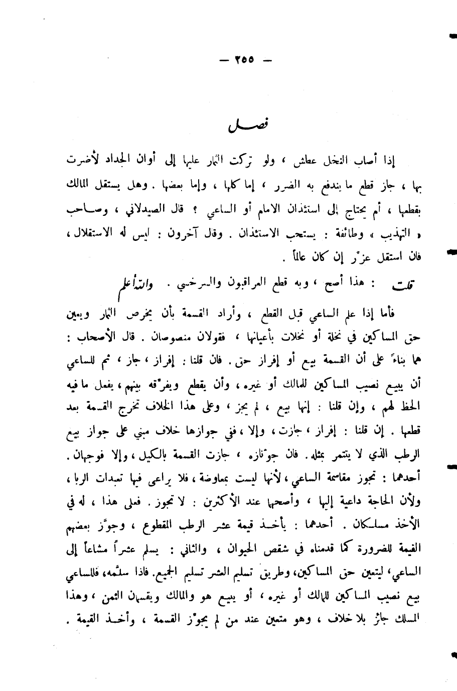 فَأَمَّا إِذَا عَلِمَ السَّاعِي قَبْلَ الْقَطْعِ، وَأَرَادَ الْقِسْمَةَ بِأَنْ يَخْرُصَ الثِّمَارَ وَيُعَيِّنَ حَقَّ الْمَسَاكِينِ فِي نَخْلَةٍ أَوْ نَخَلَاتٍ بِأَعْيَانِهَا - فَقَوْلَانِ مَنْصُوصَانِ. قَالَ الْأَصْحَابُ: هُمَا بِنَاءٌ عَلَى أَنَّ الْقِسْمَةَ بَيْعٌ أَوْ إِفْرَازُ حَقٍّ. فَإِنْ قُلْنَا: إِفْرَازٌ، جَازَ، ثُمَّ لِلسَّاعِي أَنْ يَبِيعَ نَصِيبَ الْمَسَاكِينِ لِلْمَالِكِ أَوْ غَيْرِهِ، وَأَنْ يَقْطَعَ وَيُفَرِّقَهُ بَيْنَهُمْ، يَفْعَلُ مَا فِيهِ الْحَظُّ لَهُمْ، وَإِنْ قُلْنَا: إِنَّهَا بَيْعٌ، لَمْ يَجُزْ، وَعَلَى هَذَا الْخِلَافِ تَخْرُجُ الْقِسْمَةُ بَعْدَ قَطْعِهَا. إِنْ قُلْنَا: إِفْرَازٌ - جَازَتْ، وَإِلَّا، فَفِي جَوَازِهَا خِلَافٌ مَبْنِيٌّ عَلَى جَوَازِ بَيْعِ الرُّطَبِ الَّذِي لَا يَتَتَمَّرُ بِمِثْلِهِ. فَإِنْ جَوَّزْنَاهُ، جَازَتِ الْقِسْمَةُ بِالْكَيْلِ، وَإِلَّا فَوَجْهَانِ. أَحَدُهُمَا: تَجُوزُ مُقَاسَمَةُ السَّاعِي؛ لِأَنَّهَا لَيْسَتْ بِمُعَاوَضَةٍ، فَلَا يُرَاعَى فِيهَا تَعَبُّدَاتُ الرِّبَا، وَلِأَنَّ الْحَاجَةَ دَاعِيَةٌ إِلَيْهَا، وَأَصَحُّهُمَا عِنْدَ الْأَكْثَرِينَ: لَا تَجُوزُ. فَعَلَى هَذَا لَهُ فِي الْأَخْذِ مَسْلَكَانِ أَحَدُهُمَا: يَأْخُذُ قِيمَةَ عُشْرِ الرُّطَبِ الْمَقْطُوعِ، وَجَوَّزَ بَعْضُهُمُ الْقِيمَةَ لِلضَّرُورَةِ كَمَا قَدَّمْنَاهُ فِي شِقْصِ الْحَيَوَانِ، وَالثَّانِي: يُسَلِّمُ عُشْرًا مُشَاعًا إِلَى السَّاعِي، لِيَتَعَيَّنَ حَقُّ الْمَسَاكِينِ، وَطَرِيقُ تَسْلِيمِ الْعُشْرِ تَسْلِيمُ الْجَمِيعِ. فَإِذَا سَلَّمَهُ، فَلِلسَّاعِي بَيْعُ نَصِيبِ الْمَسَاكِينِ لِلْمَالِكِ أَوْ غَيْرِهِ، أَوْ يَبِيعُ هُوَ وَالْمَالِكُ وَيُقَسِّمَانِ الثَّمَنَ، وَهَذَا الْمَسْلَكُ جَائِزٌ بِلَا خِلَافٍ، وَهُوَ مُتَعَيَّنٌ عِنْدَ مَنْ لَمْ يُجَوِّزِ الْقِسْمَةَ، وَأَخَذَ الْقِيمَةَ.