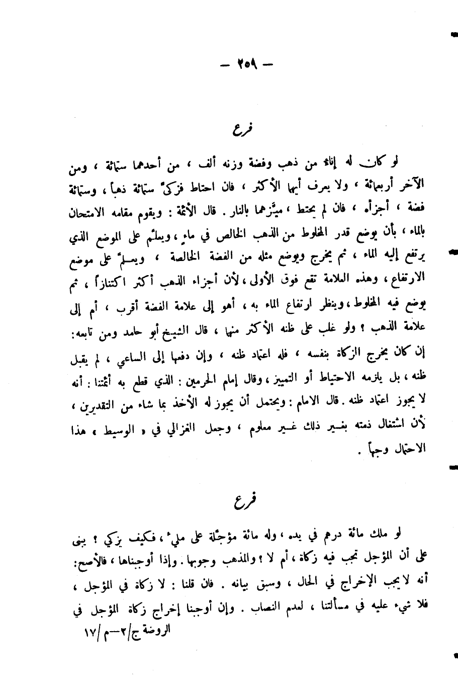 لَوْ كَانَ لَهُ إِنَاءٌ مِنْ ذَهَبٍ وَفِضَّةٍ وَزْنُهُ أَلْفٌ، مِنْ أَحَدِهِمَا سِتُّمِائَةٍ وَمِنَ الْآخَرِ أَرْبَعُمِائَةٍ، وَلَا يُعْرَفُ أَيُّهُمَا الْأَكْثَرُ، فَإِنِ احْتَاطَ فَزَكَّى سِتَّمِائَةٍ ذَهَبًا وَسِتَّمِائَةٍ فِضَّةً - أَجْزَأَهُ، فَإِنْ لَمْ يَحْتَطْ، مَيَّزَهُمَا بِالنَّارِ. قَالَ الْأَئِمَّةُ: وَيَقُومُ مَقَامَهُ الِامْتِحَانُ بِالْمَاءِ، بِأَنْ يُوضَعَ قَدْرُ الْمَخْلُوطِ مِنَ الذَّهَبِ الْخَالِصِ فِي مَاءٍ، وَيُعَلَّمَ عَلَى الْمَوْضِعِ الَّذِي يَرْتَفِعُ إِلَيْهِ الْمَاءُ، ثُمَّ يُخْرَجَ وَيُوضَعَ مَثَلُهُ مِنَ الْفِضَّةِ الْخَالِصَةِ، وَيُعَلَّمُ عَلَى مَوْضِعِ الِارْتِفَاعِ، وَهَذِهِ الْعَلَامَةُ تَقَعُ فَوْقَ الْأُولَى؛ لِأَنَّ أَجْزَاءَ الذَّهَبِ أَكْثَرُ اكْتِنَازًا، ثُمَّ يُوضَعُ فِيهِ الْمَخْلُوطُ، وَيُنْظَرُ ارْتِفَاعُ الْمَاءِ بِهِ، أَهُوَ إِلَى عَلَامَةِ الْفِضَّةِ أَقْرَبُ أَمْ إِلَى عَلَامَةِ الذَّهَبِ؟ وَلَوْ غَلَبَ عَلَى ظَنِّهِ الْأَكْثَرُ مِنْهُمَا، قَالَ الشَّيْخُ أَبُو حَامِدٍ وَمَنْ تَابَعَهُ: إِنْ كَانَ يُخْرِجُ الزَّكَاةَ بِنَفْسِهِ، فَلَهُ اعْتِمَادُ ظَنِّهِ، وَإِنْ دَفْعَهَا إِلَى السَّاعِي، لَمْ يُقْبَلْ ظَنُّهُ، بَلْ يَلْزَمُهُ الِاحْتِيَاطُ أَوِ التَّمْيِيزُ. وَقَالَ إِمَامُ الْحَرَمَيْنِ: الَّذِي قَطَعَ بِهِ أَئِمَّتُنَا أَنَّهُ لَا يَجُوزُ اعْتِمَادُ ظَنِّهِ. قَالَ الْإِمَامُ: وَيُحْتَمَلُ أَنْ يَجُوزَ لَهُ الْأَخْذُ بِمَا شَاءَ مِنَ التَّقْدِيرَيْنِ؛ لِأَنَّ اشْتِغَالَ ذِمَّتِهِ بِغَيْرِ ذَلِكَ غَيْرُ مَعْلُومٍ، وَجَعَلَ الْغَزَالِيُّ فِي الْوَسِيطِ هَذَا الِاحْتِمَالَ وَجْهًا.