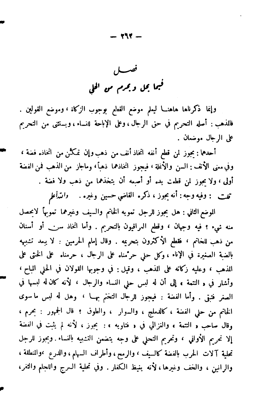 وَإِنَّمَا ذَكَرْنَاهَا هَاهُنَا لِيُعْلَمَ مَوْضِعُ الْقَطْعِ بِوُجُوبِ الزَّكَاةِ، وَمَوْضِعُ الْقَوْلَيْنِ. فَالْمَذْهَبُ: أَصْلُهُ التَّحْرِيمُ فِي حَقِّ الرِّجَالِ، وَعَلَى الْإِبَاحَةِ لِلنِّسَاءِ، وَيُسْتَثْنَى مِنَ التَّحْرِيمِ عَلَى الرِّجَالِ مَوْضِعَانِ: