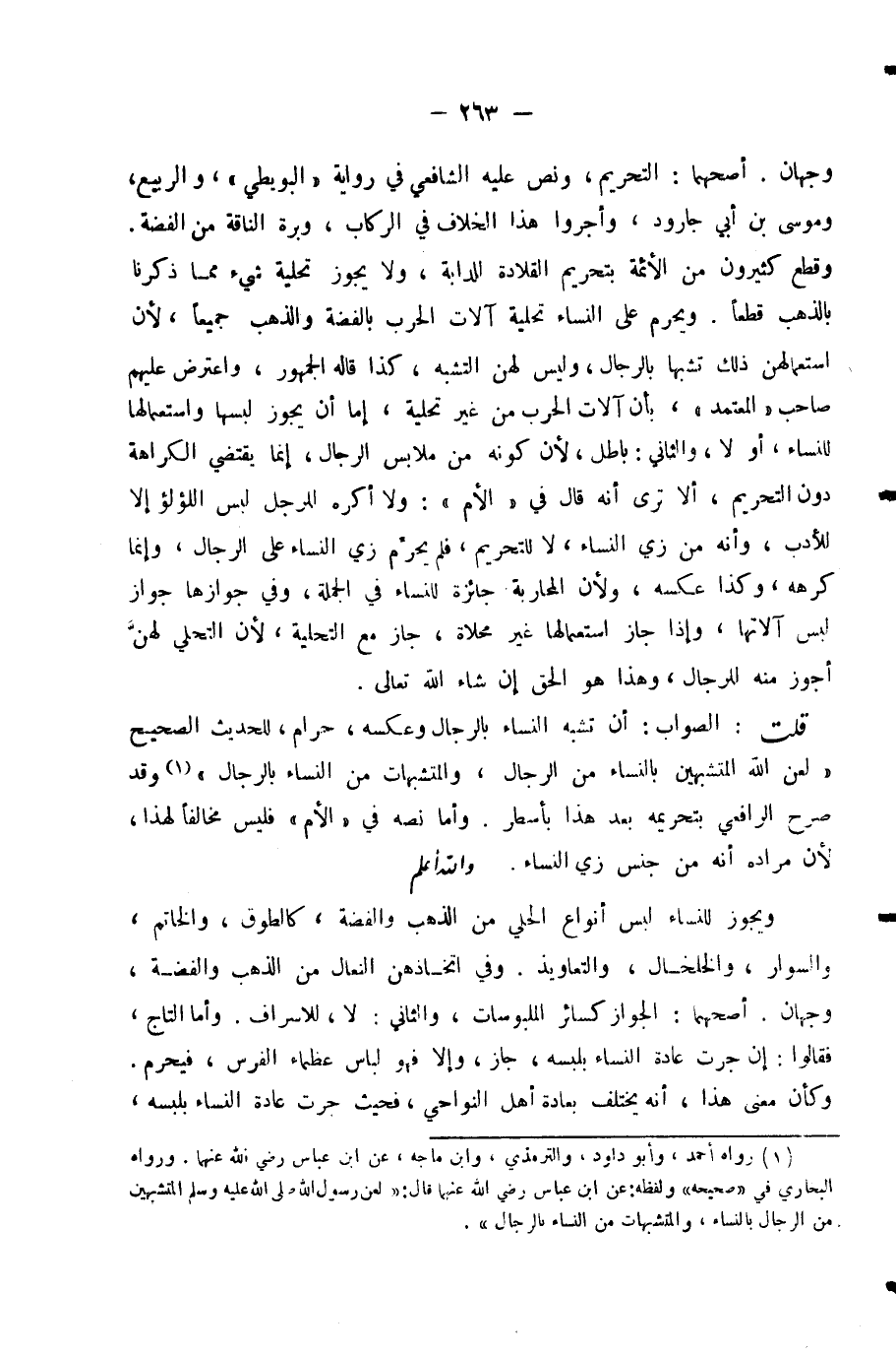 قُلْتُ: الصَّوَابُ أَنَّ تَشَبُّهَ النِّسَاءِ بِالرِّجَالِ وَعَكْسَهُ حَرَامٌ؛ لِلْحَدِيثِ الصَّحِيحِ: لَعَنَ اللَّهُ الْمُتَشَبِّهِينَ بِالنِّسَاءِ مِنَ الرِّجَالِ، وَالْمُتَشَبِّهَاتِ مِنَ النِّسَاءِ بِالرِّجَالِ وَقَدْ صَرَّحَ الرَّافِعِيُّ بِتَحْرِيمِهِ بَعْدَ هَذَا بِأَسْطُرٍ. وَأَمَّا نَصُّهُ فِي الْأُمِّ فَلَيْسَ مُخَالِفًا لِهَذَا؛ لِأَنَّ مُرَادَهُ أَنَّهُ مِنْ جِنْسِ زِيِّ النِّسَاءِ، وَاللَّهُ أَعْلَمُ.