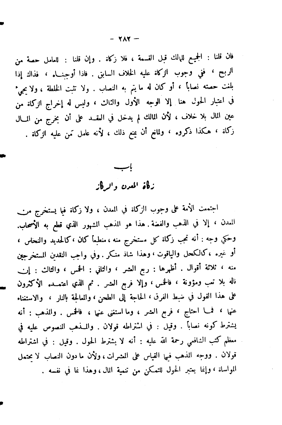 اجْتَمَعَتِ الْأُمَّةُ عَلَى وُجُوبِ الزَّكَاةِ فِي الْمَعْدِنِ، وَلَا زَكَاةَ فِيمَا يُسْتَخْرَجُ مِنَ الْمَعْدِنِ إِلَّا فِي الذَّهَبِ وَالْفِضَّةِ، هَذَا هُوَ الْمَذْهَبُ الْمَشْهُورُ الَّذِي قَطَعَ بِهِ الْأَصْحَابُ. وَحُكِيَ وَجْهٌ أَنَّهُ تَجِبُ زَكَاةُ كُلِّ مُسْتَخْرِجٍ مِنْهُ، مُنْطَبِعًا كَانَ، كَالْحَدِيدِ وَالنُّحَاسِ أَوْ غَيْرِهِ، كَالْكُحْلِ وَالْيَاقُوتِ، وَهَذَا شَاذٌّ مُنْكَرٌ. وَفِي وَاجِبِ النَّقْدَيْنِ الْمُسْتَخْرَجَيْنِ مِنْهُ ثَلَاثَةُ أَقْوَالٍ، أَظْهَرُهَا: رُبُعُ الْعُشْرِ، وَالثَّانِي: الْخُمُسُ، وَالثَّالِثُ: إِنْ نَالَهُ بِلَا تَعَبٍ وَمَئُونَةٍ فَالْخُمُسُ، وَإِلَّا فَرُبُعُ الْعُشْرِ. ثُمَّ الَّذِي اعْتَمَدَهُ الْأَكْثَرُونَ عَلَى هَذَا الْقَوْلِ فِي ضَبْطِ الْفَرْقِ الْحَاجَةُ إِلَى الطَّحْنِ، وَالْمُعَالَجَةُ بِالنَّارِ، وَالِاسْتِغْنَاءُ عَنْهُمَا، فَمَا احْتَاجَ، فَرُبُعُ الْعُشْرِ، وَمَا اسْتَغْنَى عَنْهُمَا فَالْخُمُسُ. وَالْمَذْهَبُ أَنَّهُ يُشْتَرَطُ كَوْنُهُ نِصَابًا. وَقِيلَ فِي اشْتِرَاطِهِ قَوْلَانِ. وَالْمَذْهَبُ الْمَنْصُوصُ عَلَيْهِ فِي مُعْظَمِ كُتُبِ الشَّافِعِيِّ - رَحْمَةُ اللَّهِ عَلَيْهِ - أَنَّهُ لَا يُشْتَرَطُ الْحَوْلُ. وَقِيلَ فِي اشْتِرَاطِهِ قَوْلَانِ. وَوَجْهُ الْمَذْهَبِ فِيهِمَا الْقِيَاسُ عَلَى الْمُعَشَّرَاتِ، وَلِأَنَّ مَا دُونَ النِّصَابِ لَا يَحْتَمِلُ الْمُوَاسَاةَ وَإِنَّمَا يُعْتَبَرُ الْحَوْلُ لِلتَّمَكُّنِ مِنْ تَنْمِيَةِ الْمَالِ، وَهَذَا نَمَا فِي نَفْسِهِ.