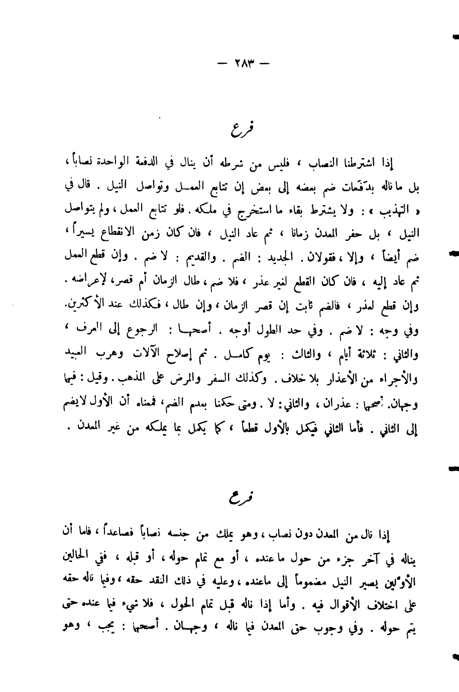 إِذَا اشْتَرَطْنَا النِّصَابَ فَلَيْسَ مِنْ شَرْطِهِ أَنْ يَنَالَ فِي الدَّفْعَةِ الْوَاحِدَةِ نِصَابًا، بَلْ مَا نَالَهُ بِدَفَعَاتٍ ضُمَّ بَعْضُهُ إِلَى بَعْضٍ إِنْ تَتَابَعَ الْعَمَلُ وَتَوَاصَلَ النَّيْلُ. قَالَ فِي التَّهْذِيبِ: وَلَا يُشْتَرَطُ بَقَاءُ مَا اسْتَخْرَجَ فِي مِلْكِهِ. فَلَوْ تَتَابَعَ الْعَمَلُ، وَلَمْ يَتَوَاصَلِ النَّيْلُ، بَلْ حُفِرَ الْمَعْدِنَ زَمَانًا، ثُمَّ عَادَ النَّيْلُ، فَإِنْ كَانَ زَمَنُ الِانْقِطَاعِ يَسِيرًا، ضُمَّ أَيْضًا، وَإِلَّا فَقَوْلَانِ؛ الْجَدِيدُ: الضَّمُّ، وَالْقَدِيمُ: لَا ضَمَّ. وَإِنْ قَطَعَ الْعَمَلَ ثُمَّ عَادَ إِلَيْهِ، فَإِنْ كَانَ الْقَطْعُ لِغَيْرِ عُذْرٍ، فَلَا ضَمَّ، طَالَ الزَّمَانُ أَمْ قَصُرَ، لِإِعْرَاضِهِ. وَإِنْ قَطَعَ لِعُذْرٍ، فَالضَّمُّ ثَابِتٌ إِنْ قَصُرَ الزَّمَانُ وَإِنْ طَالَ، فَكَذَلِكَ عِنْدَ الْأَكْثَرِينَ. وَفِي وَجْهٍ: لَا ضَمَّ. وَفِي حَدِّ الطُّولِ أَوْجُهٌ، أَصَحُّهَا: الرُّجُوعُ إِلَى الْعُرْفِ، وَالثَّانِي: ثَلَاثَةُ أَيَّامٍ، وَالثَّالِثُ: يَوْمٌ كَامِلٌ. ثُمَّ إِصْلَاحُ الْآلَاتِ وَهَرَبُ الْعَبِيدِ وَالْأُجَرَاءِ مِنَ الْأَعْذَارِ بِلَا خِلَافٍ. وَكَذَلِكَ السَّفَرُ وَالْمَرَضُ عَلَى الْمَذْهَبِ. وَقِيلَ: فِيهِمَا وَجْهَانِ، أَصَحُّهُمَا: عُذْرَانِ، وَالثَّانِي: لَا، وَمَتَى حَكَمْنَا بِعَدَمِ الضَّمِّ، فَمَعْنَاهُ أَنَّ الْأَوَّلَ لَا يُضَمُّ إِلَى الثَّانِي. فَأَمَّا الثَّانِي فَيَكْمُلُ بِالْأَوَّلِ قَطْعًا، كَمَا يَكْمُلُ بِمَا يَمْلِكُهُ مِنْ غَيْرِ الْمَعْدِنِ.