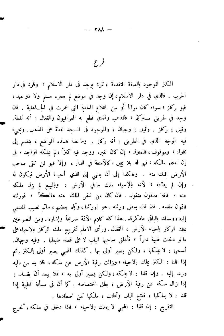الْكَنْزُ الْمَوْجُودُ بِالصِّفَةِ الْمُتَقَدِّمَةِ تَارَةً يُوجَدُ فِي دَارِ الْإِسْلَامِ، وَتَارَةً فِي دَارِ الْحَرْبِ. فَالَّذِي فِي دَارِ الْإِسْلَامِ، إِنْ وُجِدَ فِي مَوْضِعٍ لَمْ يُعَمِّرْهُ مُسْلِمٌ وَلَا ذُو عَهْدٍ فَهُوَ رِكَازٌ، سَوَاءٌ كَانَ مَوَاتًا أَوْ مِنَ الْقِلَاعِ الْعَادِيَّةِ الَّتِي عُمِرَتْ فِي الْجَاهِلِيَّةِ. فَإِنْ وُجِدَ فِي طَرِيقٍ مَسْلُوكَةٍ فَالْمَذْهَبُ وَالَّذِي قَطَعَ بِهِ الْعِرَاقِيُّونَ وَالْقَفَّالُ أَنَّهُ لُقَطَةٌ. وَقِيلَ: رِكَازٌ. وَقِيلَ: وَجْهَانِ. وَالْمَوْجُودُ فِي الْمَسْجِدِ لُقَطَةٌ عَلَى الْمَذْهَبِ. وَيَجِيءُ فِيهِ الْوَجْهُ الَّذِي فِي الطَّرِيقِ أَنَّهُ رِكَازٌ. وَمَا عَدَا هَذِهِ الْمَوَاضِعَ، يَنْقَسِمُ إِلَى مَمْلُوكٍ وَمَوْقُوفٍ، فَالْمَمْلُوكُ إِنْ كَانَ لِغَيْرِهِ وَوَجَدَ فِيهِ كَنْزًا، لَمْ يَمْلِكْهُ الْوَاجِدُ، بَلْ إِنِ ادَّعَاهُ مَالِكُهُ، فَهُوَ لَهُ بِلَا يَمِينٍ، كَالْأَمْتِعَةِ فِي الدَّارِ، وَإِلَّا فَهُوَ لِمَنْ تَلَقَّى صَاحِبُ الْأَرْضِ الْمِلْكَ مِنْهُ. وَهَكَذَا إِلَى أَنْ يَنْتَهِيَ إِلَى الَّذِي أَحْيَا الْأَرْضَ، فَيَكُونُ لَهُ وَإِنْ لَمْ يَدَّعِهِ؛ لِأَنَّهُ بِالْإِحْيَاءِ مَلَكَ مَا فِي الْأَرْضِ، وَبِالْبَيْعِ لَمْ يَزُلْ مِلْكُهُ عَنْهُ، فَإِنَّهُ مَدْفُونٌ مَنْقُولٌ. فَإِنْ كَانَ مَنْ تَلَقَّى الْمِلْكَ عَنْهُ هَالِكًا فَوَرَثَتُهُ قَائِمُونَ مَقَامَهُ. فَإِنْ قَالَ بَعْضُ وَرَثَتِهِ: هُوَ لِمُوَرِّثِنَا، وَأَبَاهُ بَعْضُهُمْ - سُلِّمَ نَصِيبُ الْمُدَّعِي إِلَيْهِ، وَسُلِكَ بِالْبَاقِي مَا ذَكَرْنَاهُ. هَذَا كُلُّهُ كَلَامُ الْأَئِمَّةِ صَرِيحًا وَإِشَارَةً.