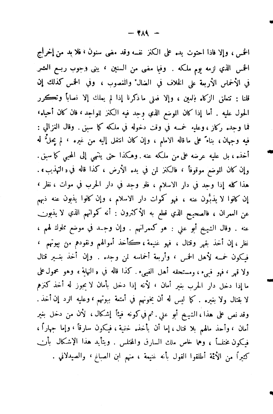 الْخُمُسَ، وَإِلَّا فَإِذَا احْتَوَتْ يَدُهُ عَلَى الْكَنْزِ نَفْسِهِ وَقَدْ مَضَى سُنُونَ، فَلَا بُدَّ مِنْ إِخْرَاجِ الْخُمُسِ الَّذِي لَزِمَهُ يَوْمَ مِلْكُهُ. وَفِيمَا مَضَى مِنَ السِّنِينَ، يُبْنَى وُجُوبُ رُبُعِ الْعُشْرِ فِي الْأَخْمَاسِ الْأَرْبَعَةِ عَلَى الْخِلَافِ فِي الضَّالِّ وَالْمَغْصُوبِ، وَفِي الْخُمُسِ كَذَلِكَ إِنْ قُلْنَا: تَتَعَلَّقُ الزَّكَاةُ بِالْعَيْنِ، وَإِلَّا فَعَلَى مَا ذَكَرْنَا إِذَا لَمْ يَمْلِكْ إِلَّا نِصَابًا وَتَكَرَّرَ الْحَوْلُ عَلَيْهِ. أَمَّا إِذَا كَانَ الْمَوْضِعُ الَّذِي وُجِدَ فِيهِ الْكَنْزُ لِلْوَاجِدِ، فَإِنْ كَانَ أَحْيَاهُ فَمَا وَجَدَهُ رِكَازٌ، وَعَلَيْهِ خُمُسُهُ فِي وَقْتِ دُخُولِهِ فِي مِلْكِهِ كَمَا سَبَقَ. وَقَالَ الْغَزَالِيُّ: فِيهِ وَجْهَانِ بِنَاءً عَلَى مَا قَالَهُ الْإِمَامُ، وَإِنْ كَانَ انْتَقَلَ إِلَيْهِ مِنْ غَيْرِهِ، لَمْ يَحِلَّ لَهُ أَخْذُهُ، بَلْ عَلَيْهِ عَرْضُهُ عَلَى مَنْ مَلَكَهُ عَنْهُ. وَهَكَذَا حَتَّى يَنْتَهِيَ إِلَى الْمُحْيِي كَمَا سَبَقَ.