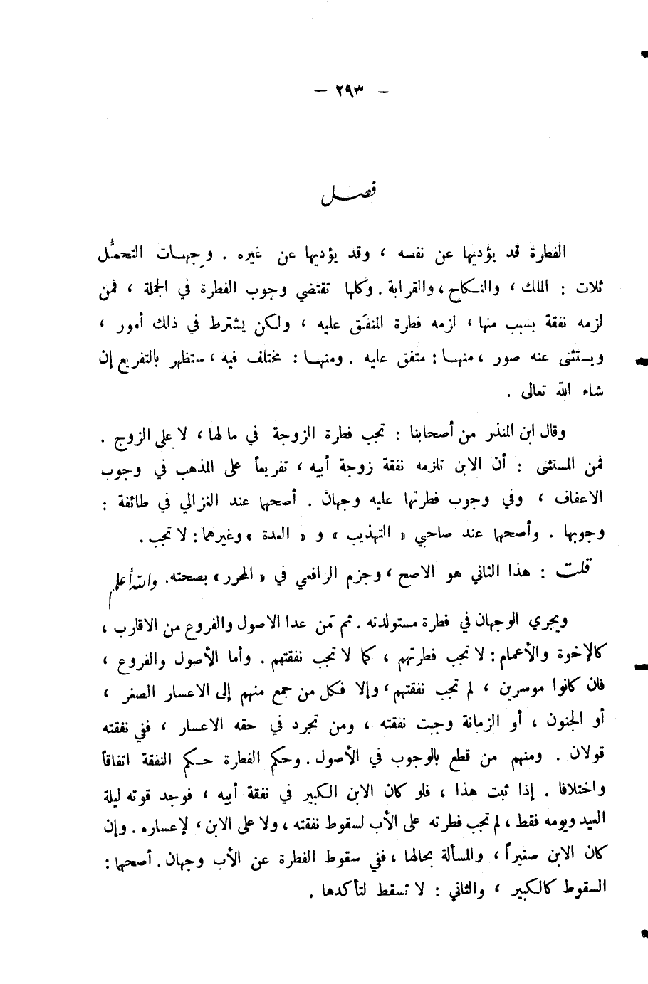 وَمِنْهُمْ مَنْ قَطَعَ بِالْوُجُوبِ فِي الْأُصُولِ. وَحُكْمُ الْفِطْرَةِ حُكْمُ النَّفَقَةِ اتِّفَاقًا وَاخْتِلَافًا. إِذَا ثَبَتَ هَذَا، فَلَوْ كَانَ الِابْنُ الْكَبِيرُ فِي نَفَقَةِ أَبِيهِ، فَوَجَدَ قُوَّتَهُ لَيْلَةَ الْعِيدِ وَيَوْمَهُ فَقَطْ، لَمْ تَجِبْ فِطْرَتُهُ عَلَى الْأَبِ لِسُقُوطِ نَفَقَتِهِ، وَلَا عَلَى الِابْنِ، لِإِعْسَارِهِ.