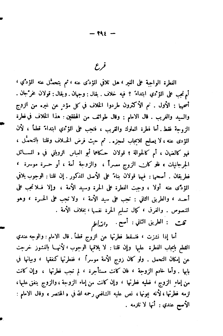 قَالَ الْإِمَامُ: وَقَالَ طَوَائِفُ مِنَ الْمُحَقِّقِينَ: هَذَا الْخِلَافُ فِي فِطْرَةِ الزَّوْجَةِ فَقَطْ. أَمَّا فِطْرَةُ الْمَمْلُوكِ وَالْقَرِيبِ، فَتَجِبُ عَلَى الْمُؤَدِّي ابْتِدَاءً قَطْعًا، لِأَنَّ الْمُؤَدَّى عَنْهُ، لَا يَصْلُحُ لِلْإِيجَابِ لِعَجْزِهِ.